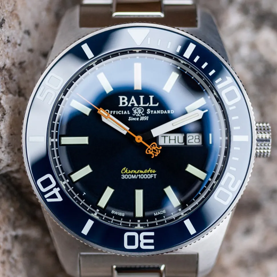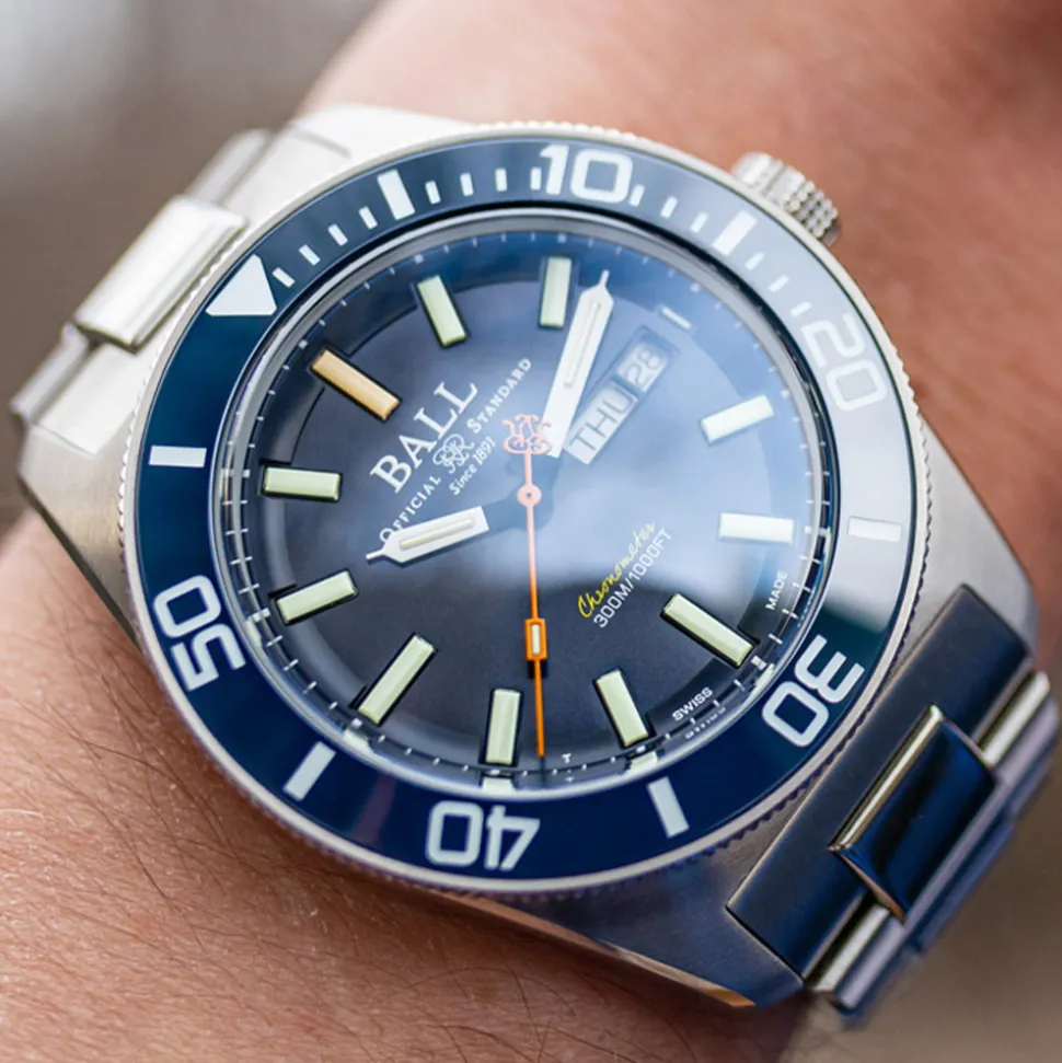 The Ball Engineer Master II Skindiver Heritage is an extension of the sea exploring line. This was launched in partnership with world champion constant weight freediver Guillaume Nery. A certified chronometer, it’s accurate to -4/+6 seconds per day. Find out more about COSC here.