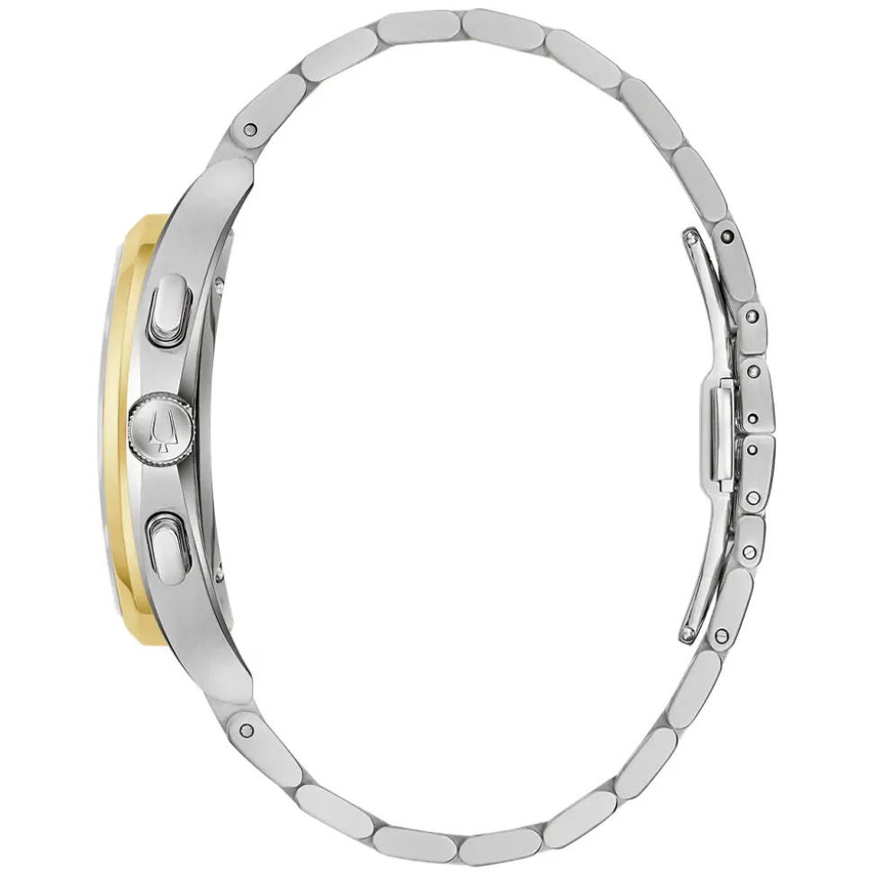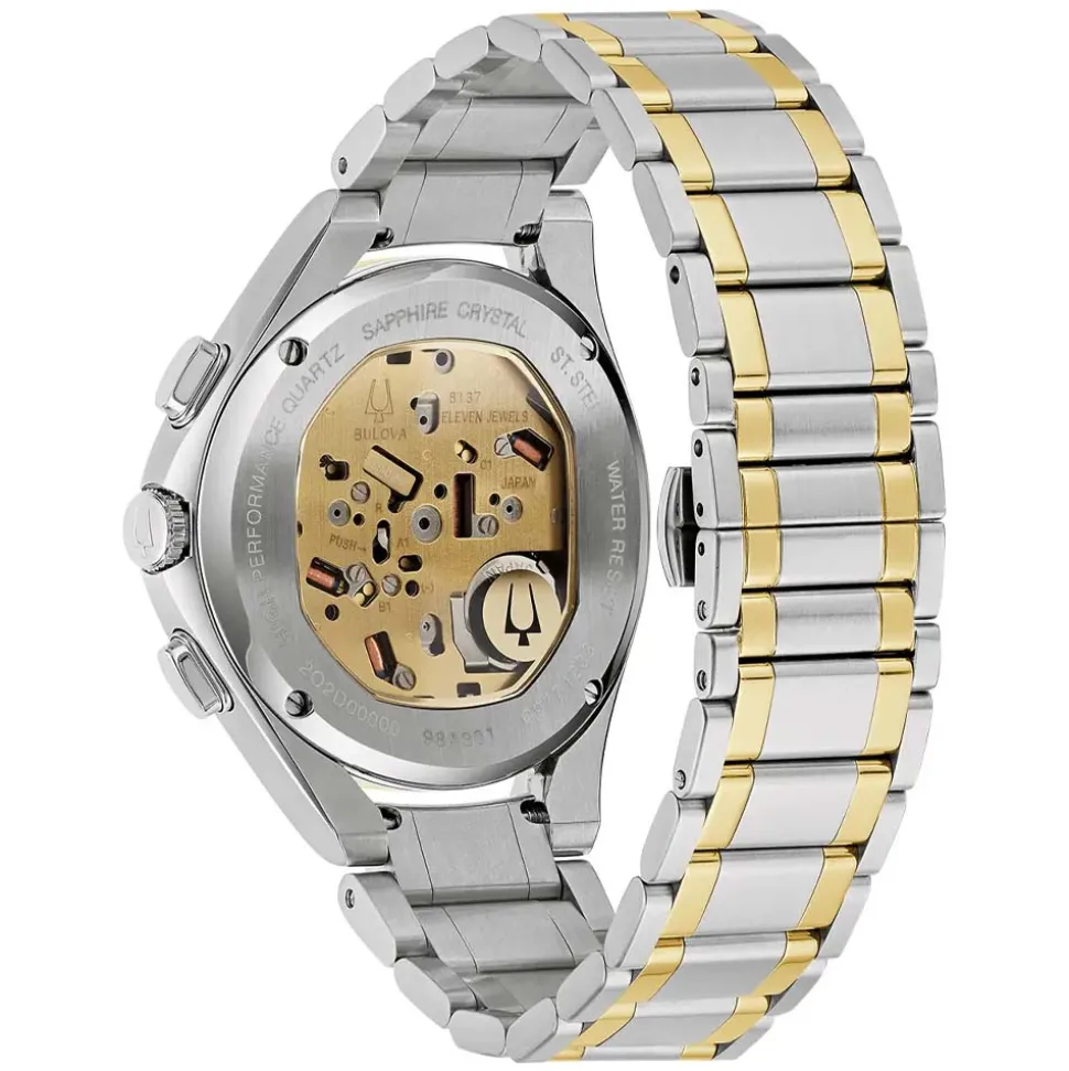 Reinterpreting the elegant lines of the original CURV, this new Bulova timepiece offers a polished aesthetic that pairs perfectly with your lifestyle. The 44mm case is in two tone stainless steel with the pushers and crown in a silver tone. The black dial features a vertical lined pattern. Also, it reveals glimpses of the intricate movement below. Three sub-dials display the elapsed chronograph time in 12-hour, 60-minute, and 60-second intervals. Additionally, the chronograph 60-second sub dial at 6 o’clock doubles as the standard seconds hand. The dual mode is implemented by the 4 o’clock pusher. Moreover, an exhibition caseback also allows a view of the rear which is something of a rarity for a quartz watch.