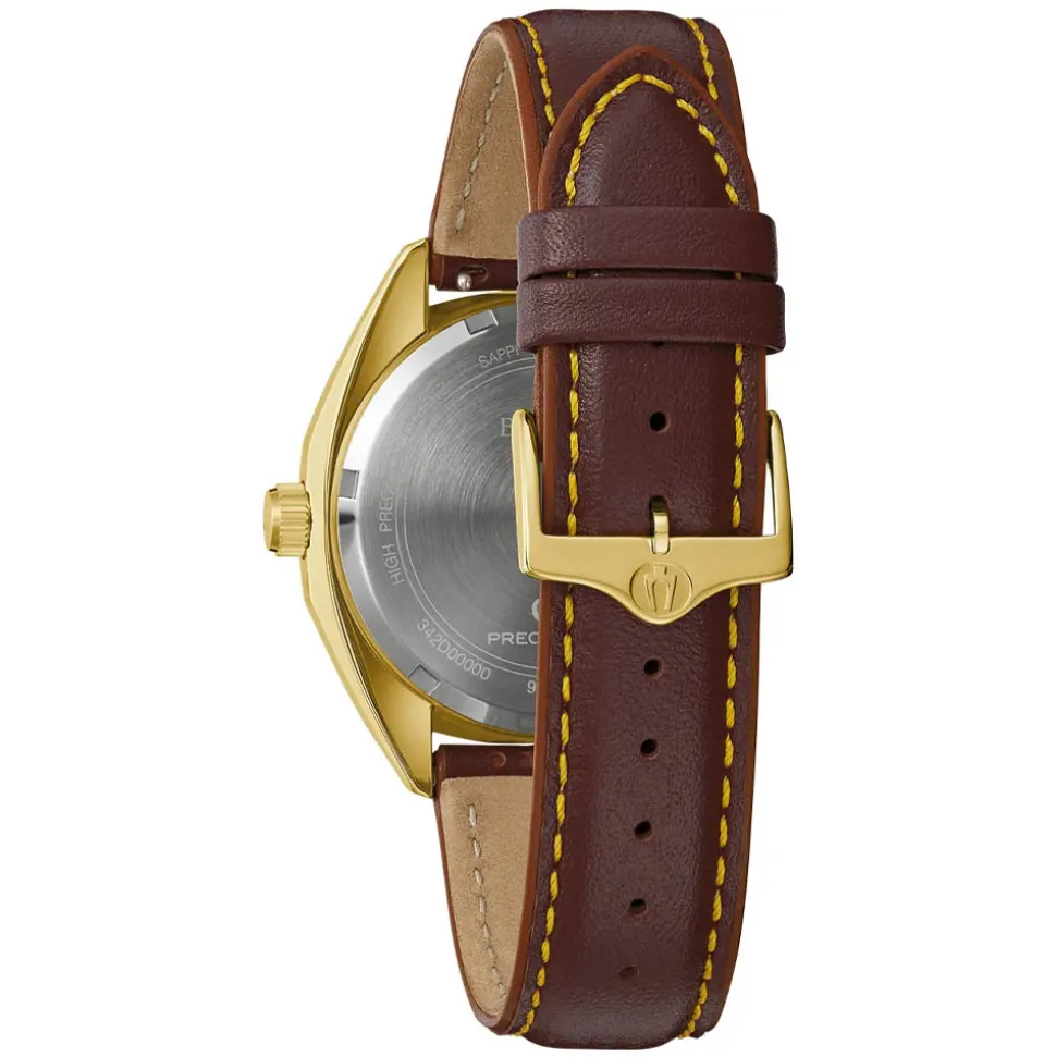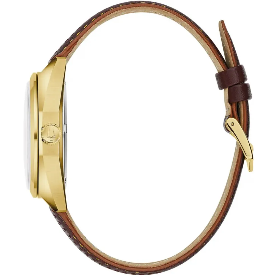 A perforated brown leather strap with yellow contrast stitching secures the Bulova Jet Star Gold Tone Watch to the wrist. Fitted with quick release spring bars, it’s easy to remove the strap yourself and swap it out for a different look.