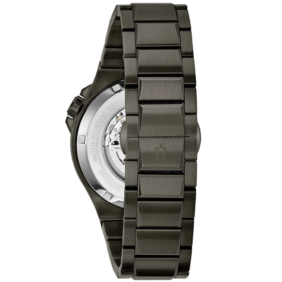 The Bulova Maquina Skeleton Automatic Watch is a particularly bold and interesting timepiece. With a 46mm gunmetal ion plated stainless steel case, it has quite an imposing presence on the wrist. Framed by a smooth bezel, the black dial has an open aperture which allows a great view of the skeleton automatic movement. Additionally, an exhibition caseback also allows a fascinating view of the reverse side.