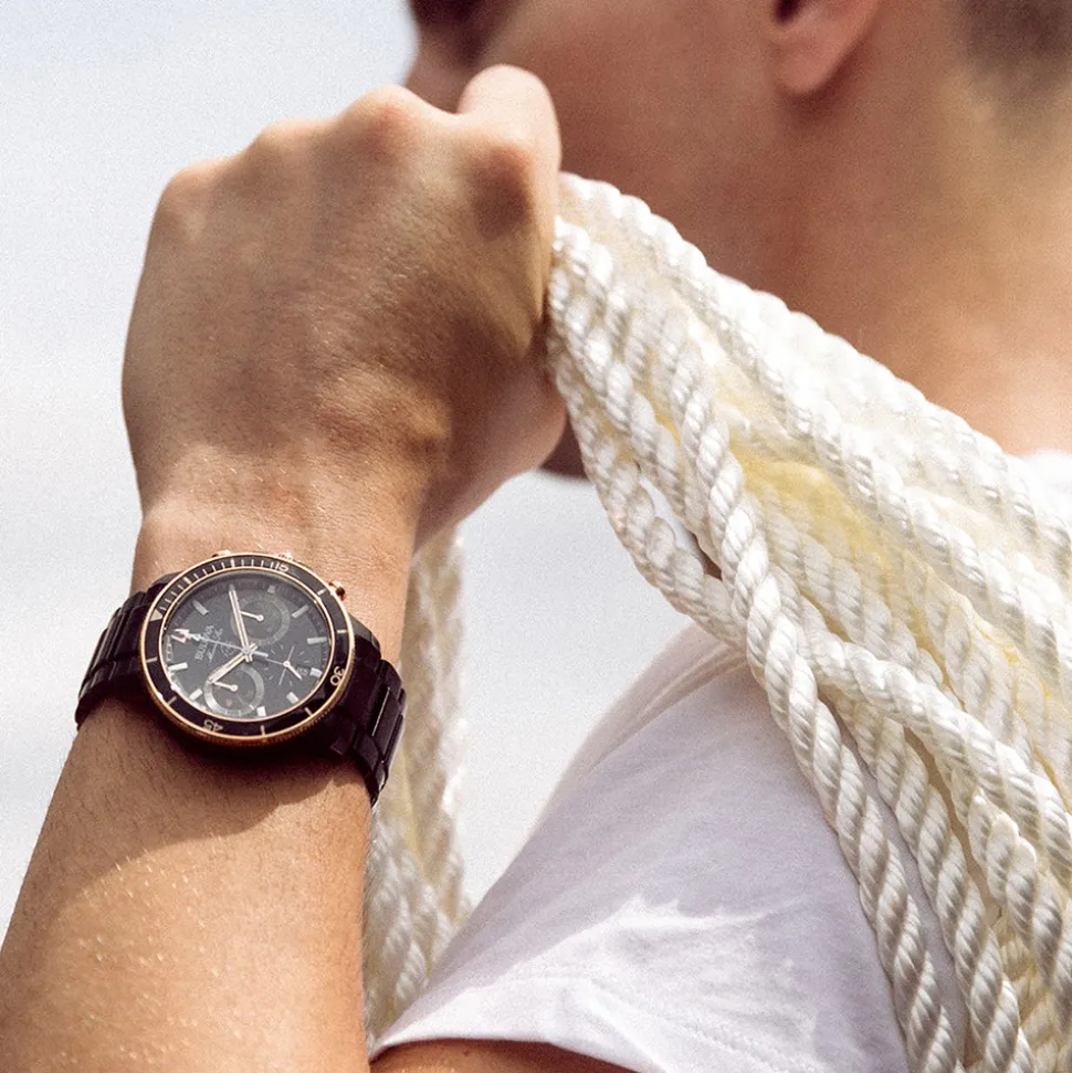 - Black IP stainless steel case with rose gold tone accents, 45mm diameter, 15mm depth
