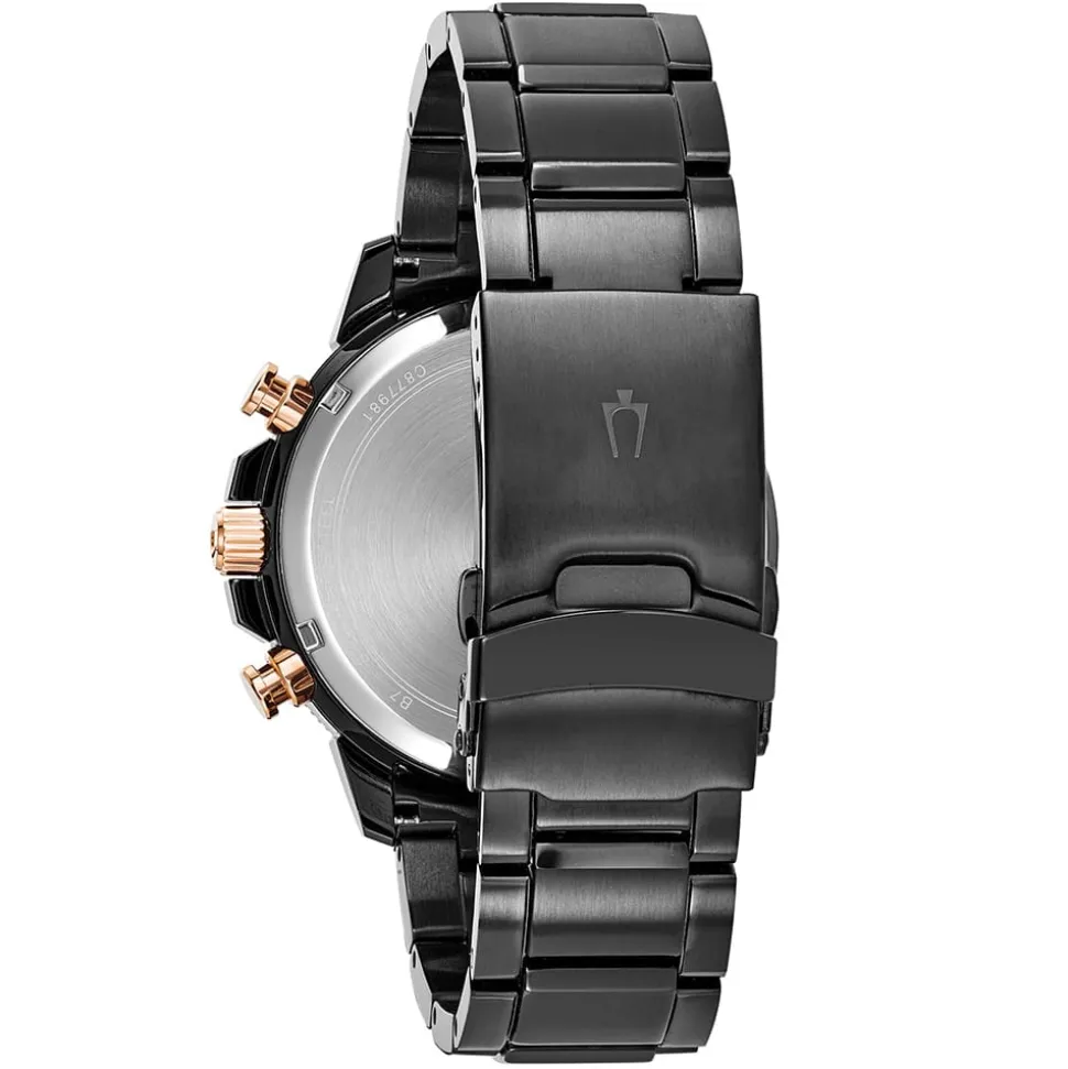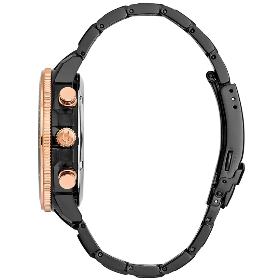 Sometimes a watch really demands your attention: the Bulova Marine Star Chronograph is exactly that watch. The 45mm case has quite a presence on the wrist and is bold in black ion-plated stainless steel (view two tone version here). Also rose gold accents on the rotating bezel, crown and pushers contrast with the black for a striking look. Additionally, the dial also has rose gold accents. White hour markers and a white minute track ensure the dial is legible. The dial is protected by a domed mineral crystal.