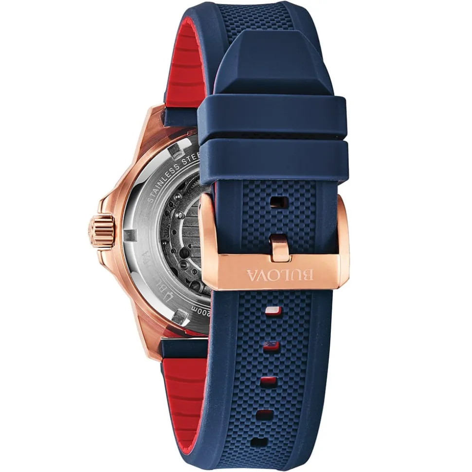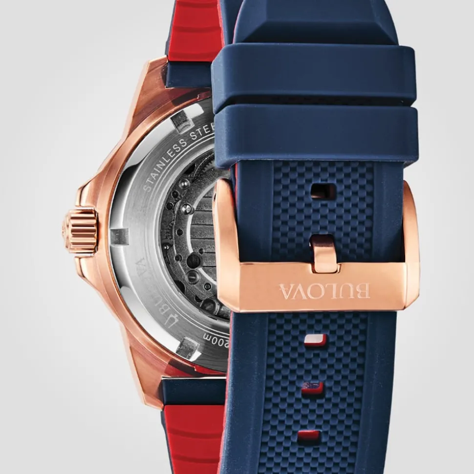 Sometimes a watch can really demand your attention: the Bulova Marine Star Heartbeat Watch is exactly that watch. The 45mm case is in rose gold and blue IP stainless steel. The contrast between the rose tone and the blue is incredibly striking. The bezel is set with six blue rivets. Similarly, there is also a blue ring under the bezel. These details complement the blue dial which has applied rose gold roman numerals set against a ridged textured outer ring. Additionally, the seconds are displayed on a sub dial which has red detailing and a red hand. An aperture in the dial reveals the “Heartbeat” of the watch: it’s automatic skeleton movement. The dial is protected by a mineral crystal.