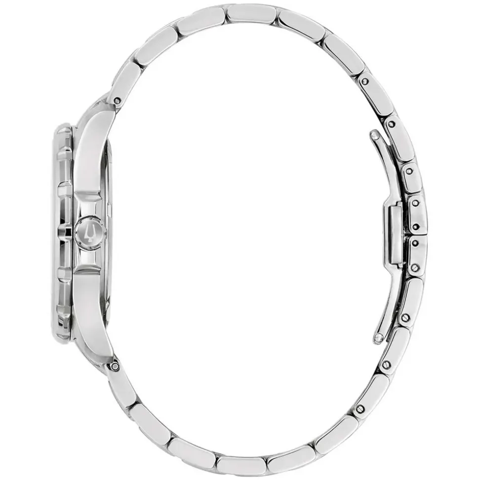 Additionally, the Bulova Marine Star Aqua Dial Watch features a solid link bracelet in stainless steel. Wide links run through the center with narrower links at the outer edges. Finally, a folding clasp with double push buttons ensures the security of the watch.