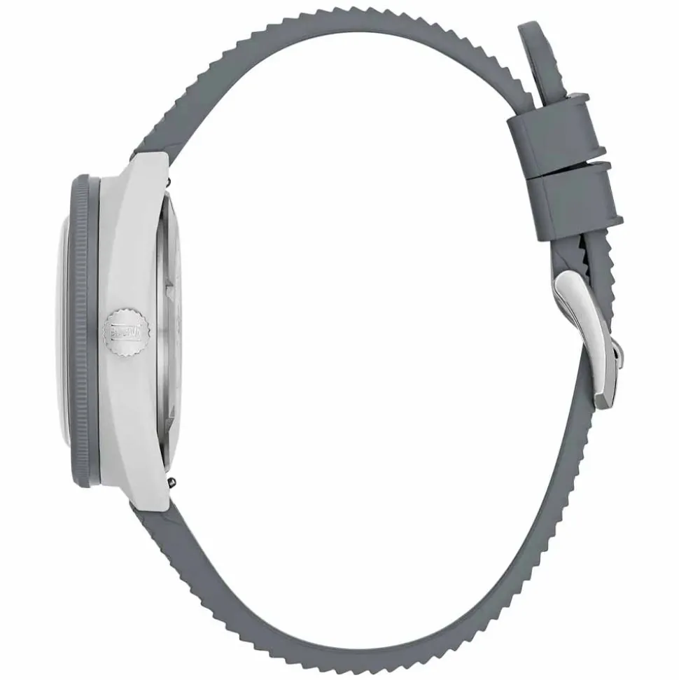 From the first glance, the 41mm case captures attention with its recognisable retro silhouette—now reimagined in Bulova’s pioneering Hybrid Ceramic. This new material delivers a luxuriously smooth feel and superior durability, making the Bulova Snorkel Great White Shark Watch as practical as it is stylish. The case’s light grey tone complements the white wave-patterned dial, a subtle yet striking nod to the sea. Adding another layer of character, the bi-colour unidirectional bezel enhances the dive-watch aesthetic while ensuring readability and precision.