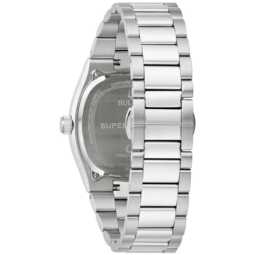Firstly, with a 38mm silver-tone stainless steel case, the Bulova Super Seville suits any style, while the retro TV-shaped case seamlessly flows into an integrated 3-link bracelet. Additionally, a push-button deployment clasp ensures secure, easy wear.
