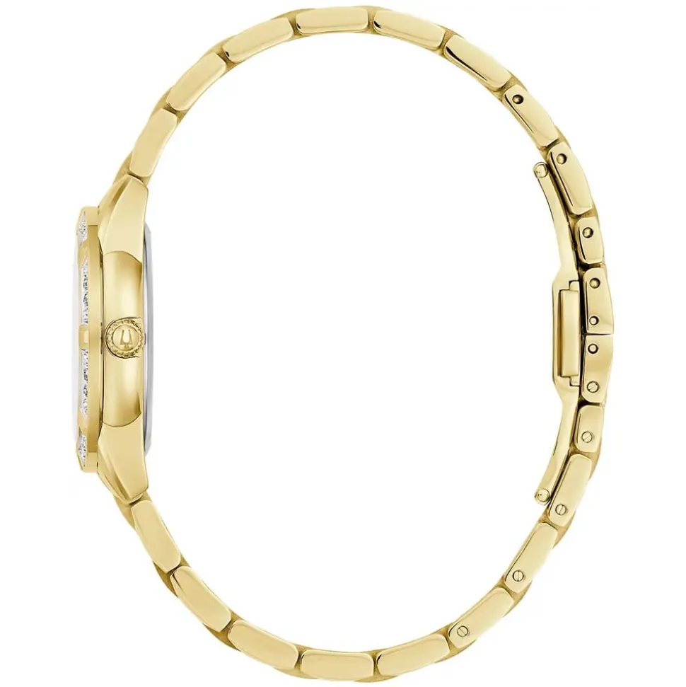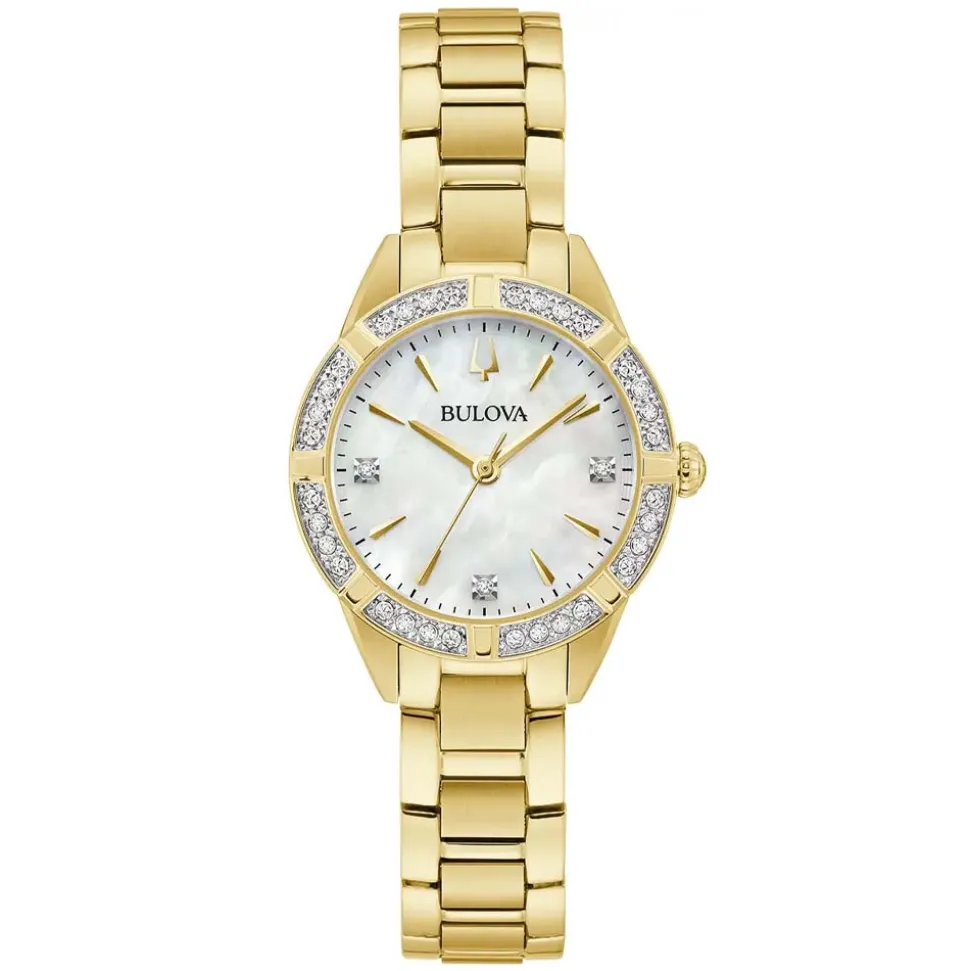 The Bulova Sutton Diamond Bezel Watch features a gold tone stainless steel bracelet. Wide brushed links run through the centre with narrower links at the outer edges. Finally, a folding clasp with double push buttons provides both security and ease of wear. A silver tone version is also available here.