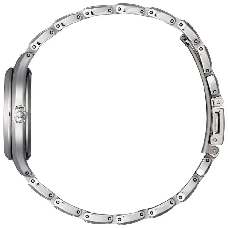 Firstly, the Super Titanium case is 30mm in diameter. Citizen’s own innovation, Titanium is given a coating of Duratect. This results in a material that is durable, scratch resistant and has hypoallergenic properties. Also, it’s lightweight and comfortable to wear. Secondly, the blue/grey dial is in Mother of Pearl with applied roman numerals and hour markers. Additionally, four diamonds add a touch of sparkle and a white printed minute track aids legibility. Moreover, sword-shaped hour and minute hands add to the classic look and a date indicator is a useful feature.