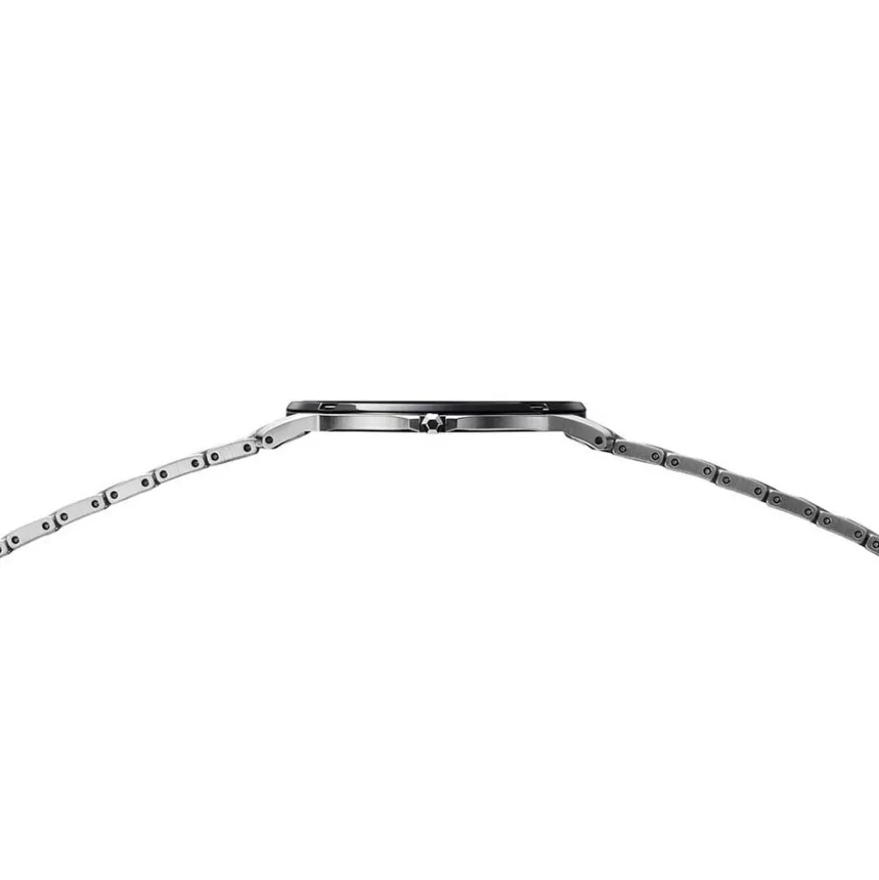 Firstly, this hand-assembled model features a zirconia ceramic bezel with stunning etched texture. Secondly, the Duratect Platinum-coated stainless steel case offers lightweight durability. Ultra-thin, the 39mm diameter case is just 3.88mm thick. Additionally, a black hobnail dial complements the bezel.