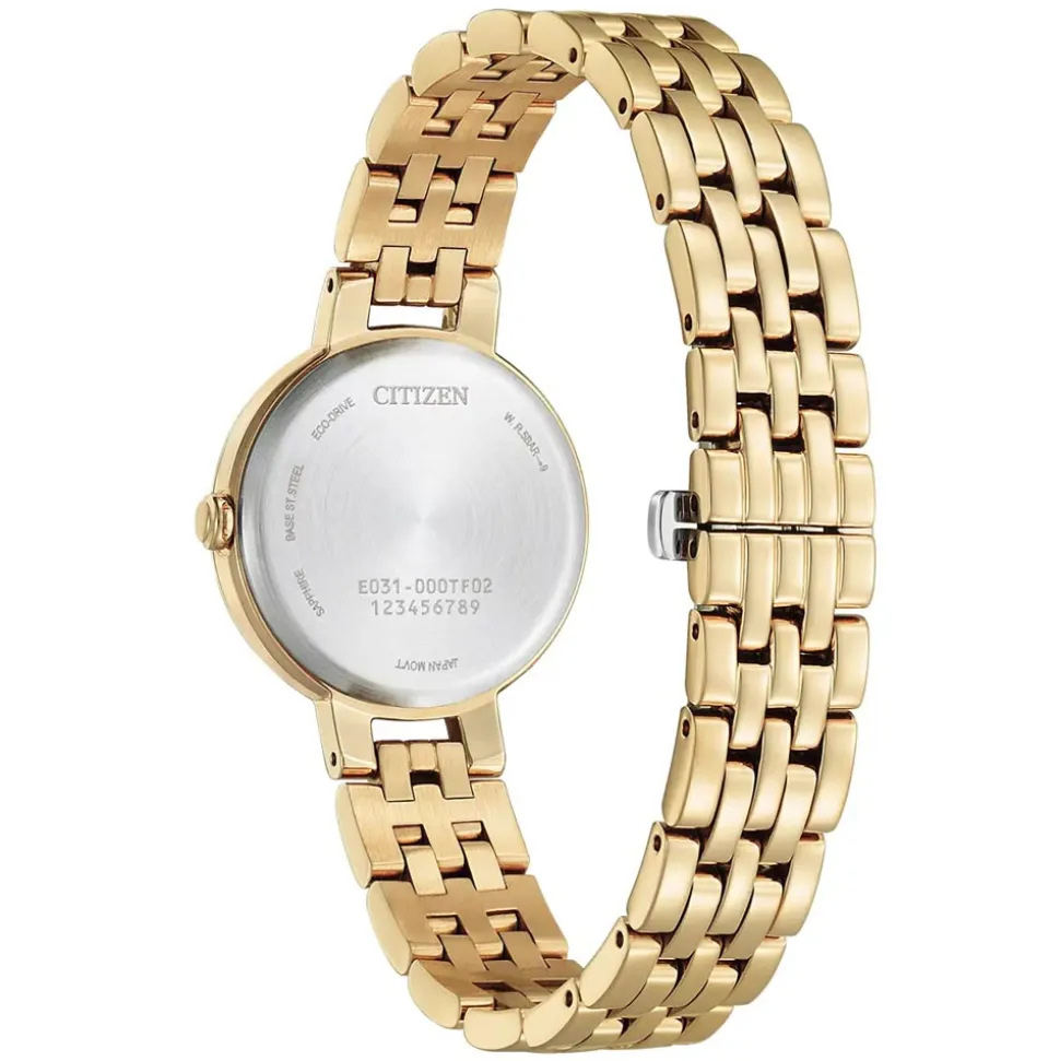 Furthermore, the dial is in a pink shade that complements the case and bracelet (view blue dial version here). The rose gold-tone hour markers create a clean contrast, making the time easy to read at a glance. Each hand, including the seconds hand, is crafted in rose gold-tone stainless steel, adding a touch of refinement. The centre seconds hand is especially elegant, showcasing the looped “L” detail that marks it as part of Citizen’s ladies’ line. This subtle, signature touch brings a unique identity to the design. Finally, a sapphire crystal covers the dial, providing superior scratch resistance and a clear view of the time.