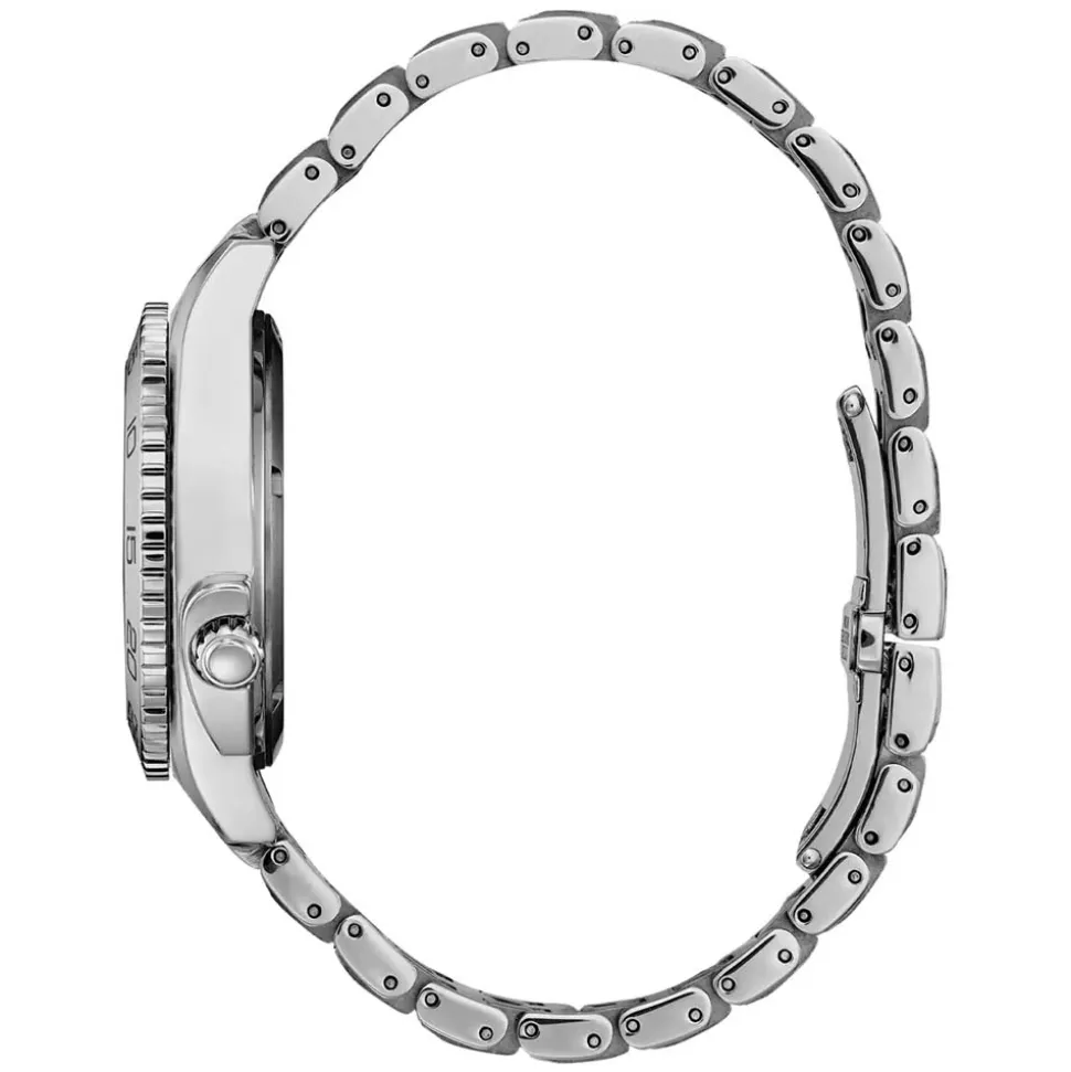 Firstly, the light blue dial twinkles with eleven diamond accents (view dark blue version here). Secondly, a rotating elapsed time bezel complements the dial and adds a sporty touch. Additionally, a convenient date window at 6 o’clock, ensures you stay punctual and well-prepared. Furthermore, the 35mm stainless steel case seamlessly connects to the brushed and polished bracelet. A folding clasp secures it to the wrist.