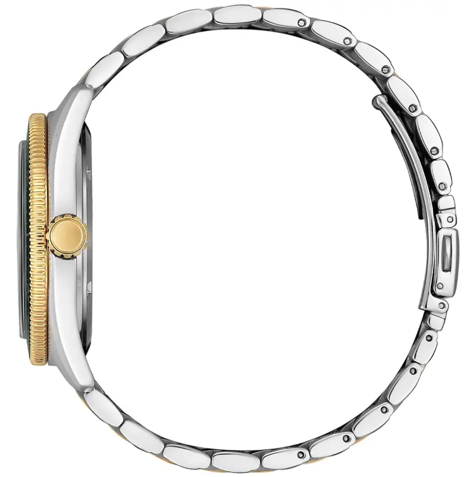 The 45mm case is in two tone stainless steel (view all steel version here). The silver tone of the case complements the pine green dial and bezel. Retro shaped hour markers and a white minute track ensure that the watch is legible and easy to read at a glance. The bracelet is in two tone stainless steel and has a folding clasp with double push button release. Additionally, the gold tone crown is easy to grip and complements the gold elements on the dial, bracelet and bezel.