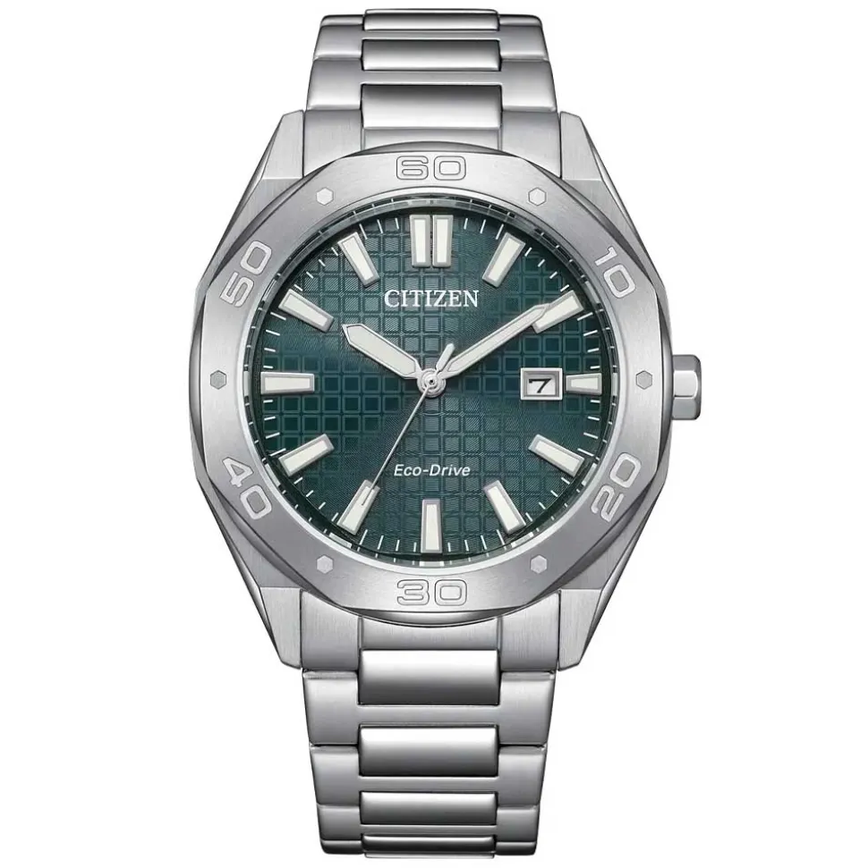 Featuring a 41mm stainless steel case, the Citizen Men’s Sport boasts a fixed bezel with a brushed finish. The green dial displays a sophisticated waffle pattern (view the blue dial version here). Bold, luminous hands and indices enhance visibility in low light conditions, while the date indicator at 3 o’clock adds practicality. A minute track along the outer edge of the dial further improves legibility.