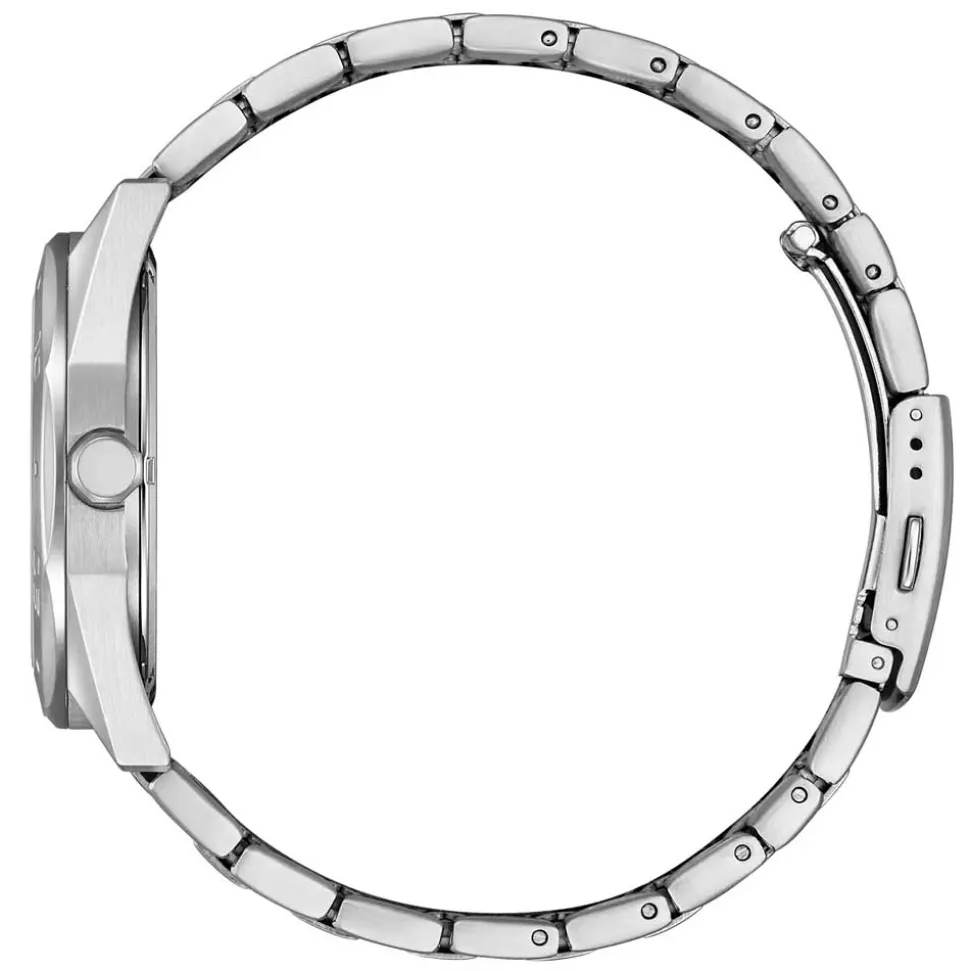 With water resistance up to 10 bars (100m) and a screwed caseback, this watch ensures durability for all-purpose wear. Furthermore, the faceted shape of the crown is reflected in the hexagonal shapes engraved on the bezel. Finally, the stainless steel bracelet with a folding clasp securely fastens the watch to your wrist.