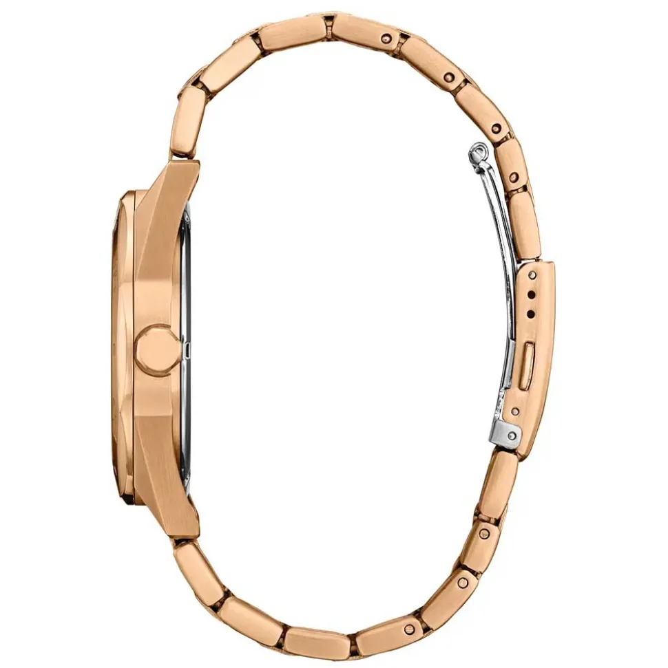 With water resistance up to 10 bars (100m) and a screwed caseback, this watch ensures durability for all-purpose wear. Furthermore, the faceted shape of the crown is reflected in the hexagonal shapes engraved on the bezel. Finally, the rose gold tone bracelet with a folding clasp securely fastens the watch to your wrist.