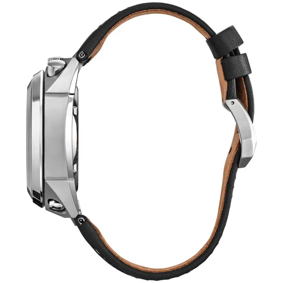 With great attention to detail, the way the leather strap fits around the case is quite unique to this model. In a nod to its 70’s predecessor, the strap appears almost moulded around the case with even the pushers and crown set into it. In soft black leather, it features perforations to increase air flow and grey contrast stitching. Finally, a heavy duty stainless steel pin buckle ensures the security of the watch.