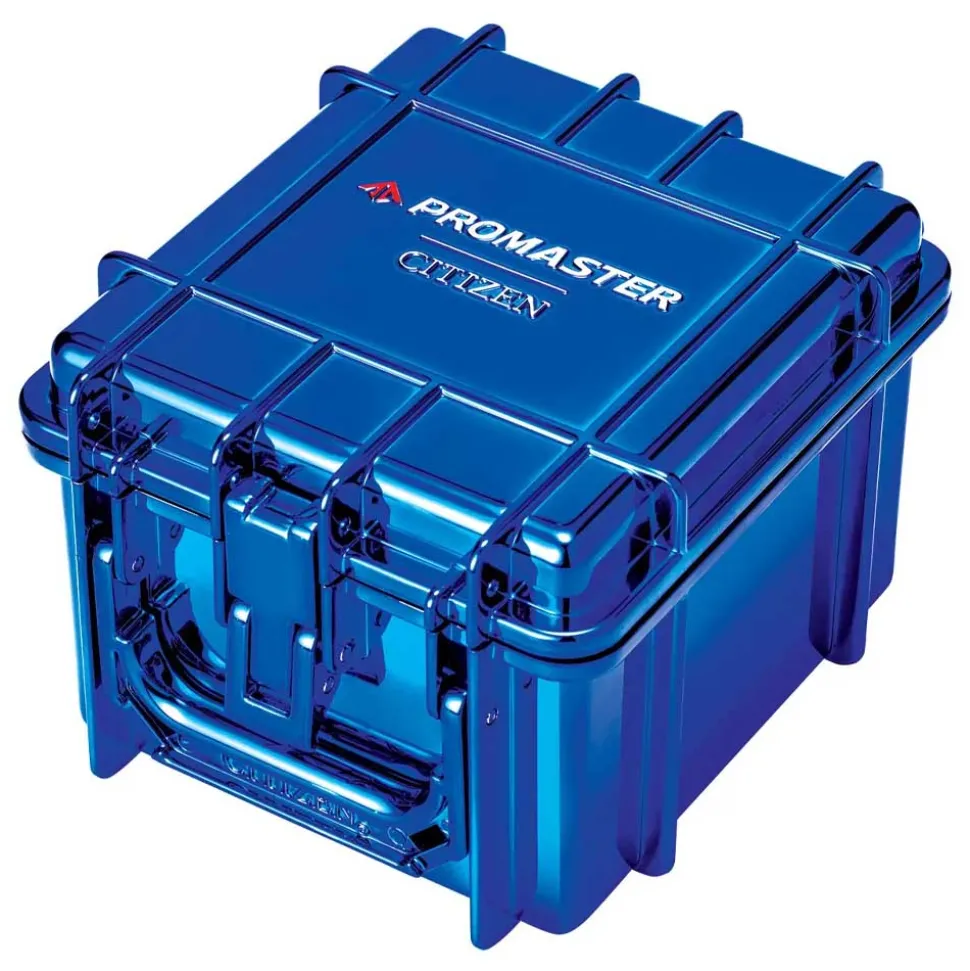 Firstly, with a hand assembled movement, the Citizen Promaster Bullhead Limited Edition features a 1/5 second flyback chronograph and alarm. Instantaneous flyback means that the second hand flies back to zero and instantly starts counting again when the flyback button is pressed. Secondly, the watch also features a tachymeter, power reserve indicator and date. Additionally, the combination of blue on the dial with the black of the chrono sub dials and red hands adds to the retro look of the watch. Furthermore, simple luminous hour, minute hands and hour markers ensure that the dial is legible at all times.