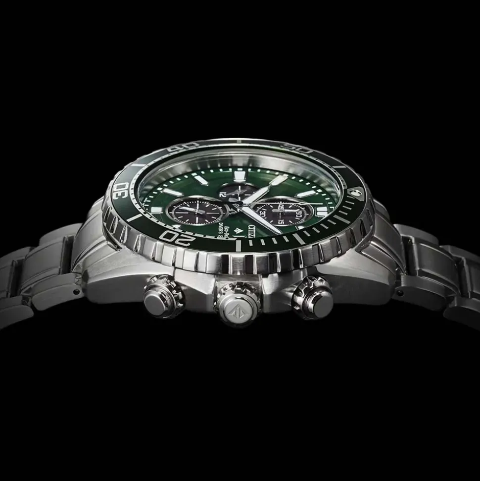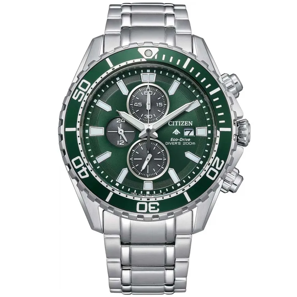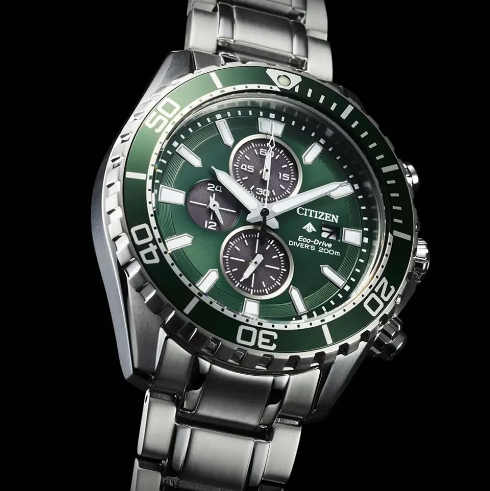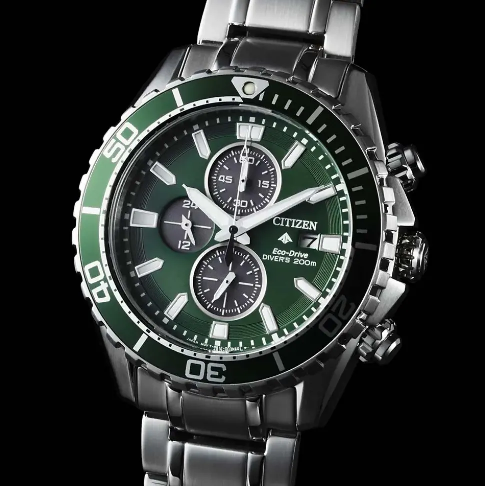 Equipped with an Eco-Drive movement, the Citizen Promaster Diver Green Dial Chronograph is powered by light and will never need a battery. Covered by a fantastic Five Year Warranty, this is the ideal watch to accompany you on your next diving adventure.