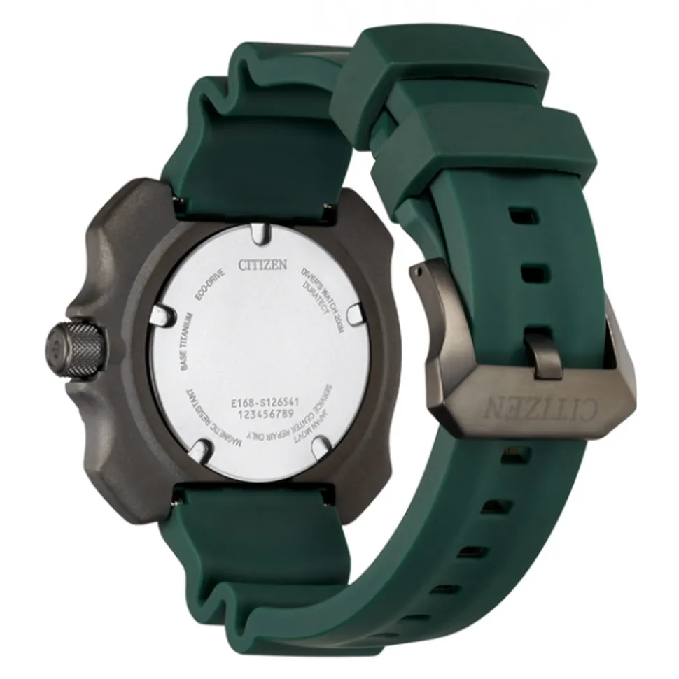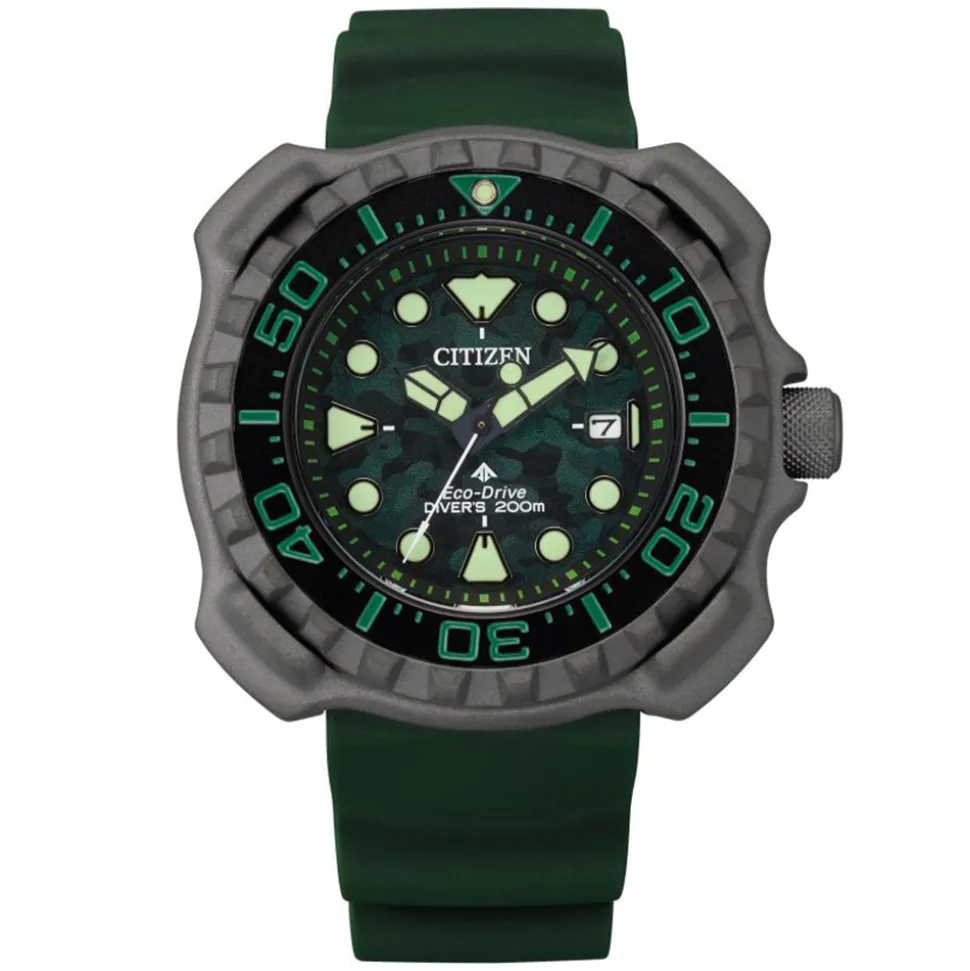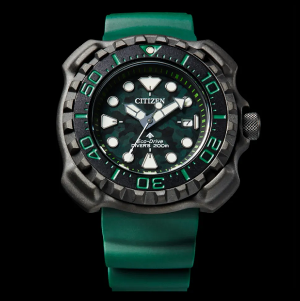 Firstly, made from Super Titanium™ (titanium with Citizen’s own Duratect coating for increased resistance), the watch is both light-weight and durable. Five times harder than stainless steel, it is the perfect material for a diver’s watch. Secondly, the 47mm case has a black uni-directional elapsed time bezel. Bold, green indices on the bezel make it easy to read at a glance. Furthermore, the bezel surrounds the green dial with its cool, camouflage pattern. The hands and hour markers are in a luminous green finish for high visibility in poor light. Also, a date indicator at 3 o’clock is a useful addition.