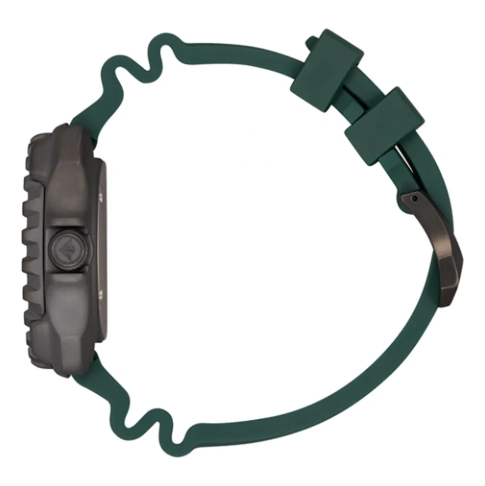 Water resistant to 20 bars (200m), the watch has a screwed caseback and easy-grip screw down crown. Finally, a green accordion-style polyurethane strap secures the watch to the wrist. Allowing for contraction and expansion of the wrist under water, it’s a comfortable choice.