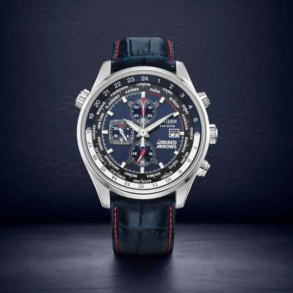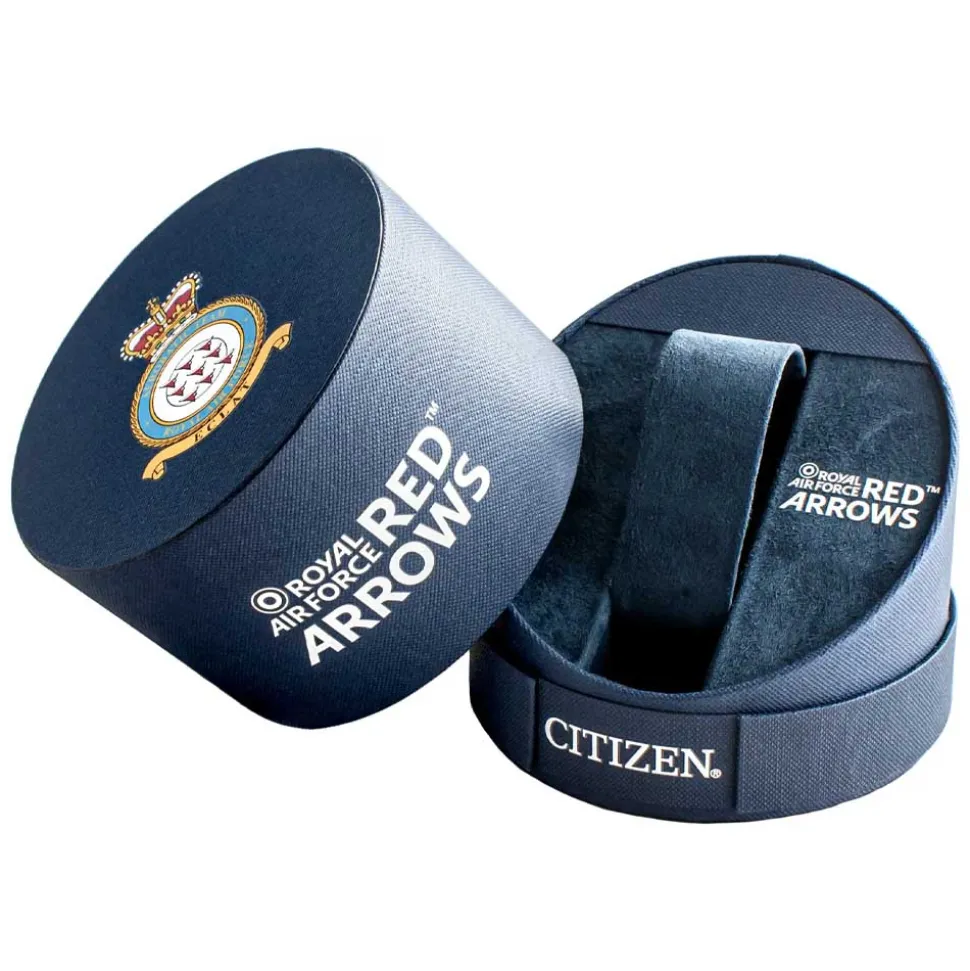 Equipped with an Eco-Drive movement, the Citizen Red Arrows Chronograph with Blue Strap is powered by light and will never need a battery. Finally, this special watch comes in a special blue Red Arrows branded presentation box. Covered by a fantastic Five Year Warranty, this is a distinctive and unique watch that you’ll be proud to own.