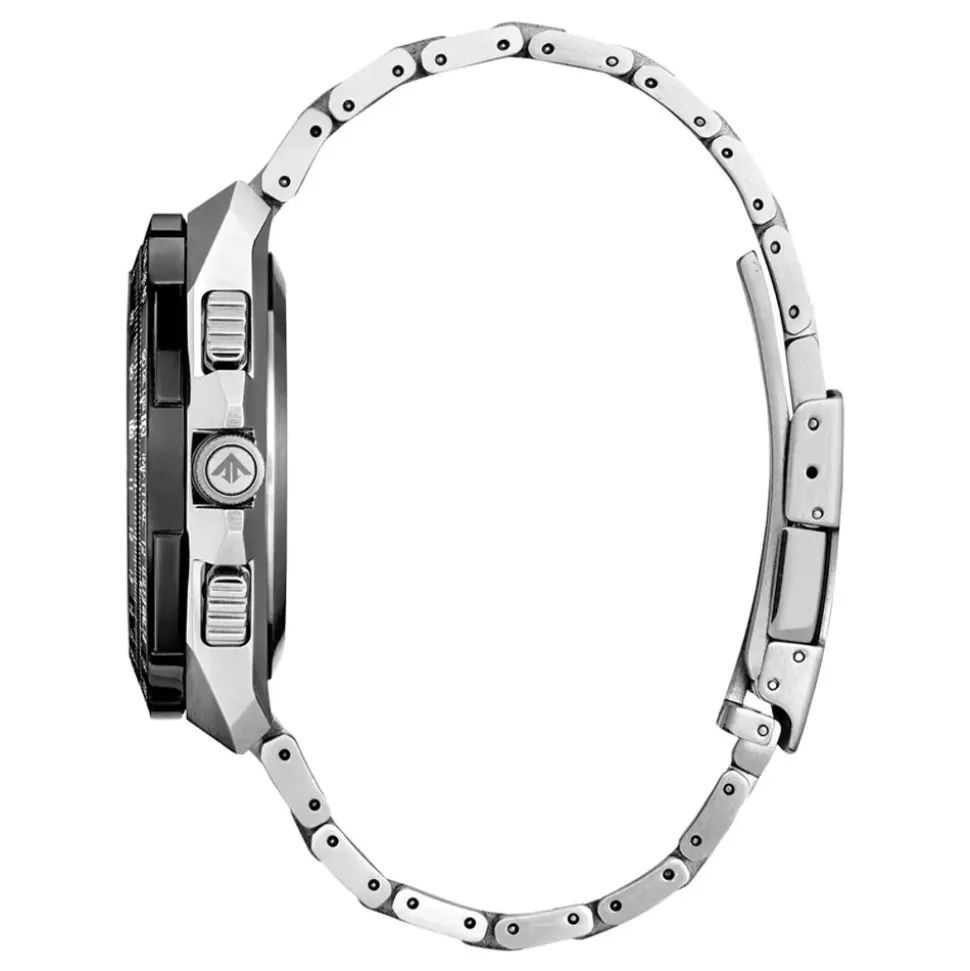The 46mm case is in silver tone stainless steel and features a pilot’s rotating slide rule bezel (view Super Titanium Skyhawk model here). Similarly, the bracelet is also in silver tone stainless steel and secures to the wrist with a folding clasp. Furthermore, the dial draws inspiration from a pilot’s in-flight visual experience. Moreover, a heavy duty crown and integrated pushers completes the line-up.