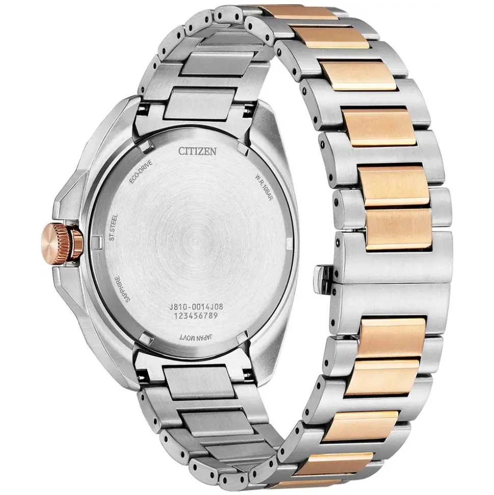 Firstly, the cushion-shape two tone stainless steel case of the Citizen Sport Blue Dial Endicott Watch is 42mm in diameter so it suits most wrist sizes. However, the shape of the case gives the watch quite a presence on the wrist. Secondly, the blue dial adds to the retro look with applied hour indexes and arabic figures at 12 and 6 in a brushed finish to match the case and bracelet. Also, they’re oversized for impact and to increase legibility. Moreover, the texture of the matt blue dial ensures they stand out. Additionally, the hour and minute hands are shaped to complement the hour indexes. Also, they are luminous for improved legibility. A date indicator at 3 o’clock is a useful feature and the dial is protected by a sapphire crystal. Furthermore, the rose gold crown is ridged for easy grip and is protected on either side by the case.