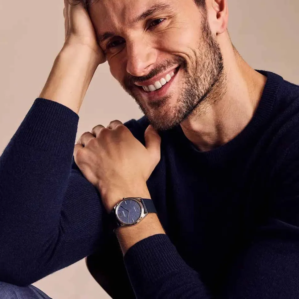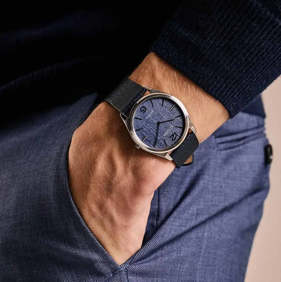 Firstly, the 38mm stainless steel case strikes a perfect balance between presence and comfort (view two tone version here). Secondly, the refined blue dial features a luxurious vertical brushed finish. Also, silver-tone applied hour markers contrast beautifully against the dial, ensuring exceptional legibility. Additionally, the slim hour and minute hands enhance the watch’s classic aesthetic, embodying Citizen’s commitment to clean and modern design.