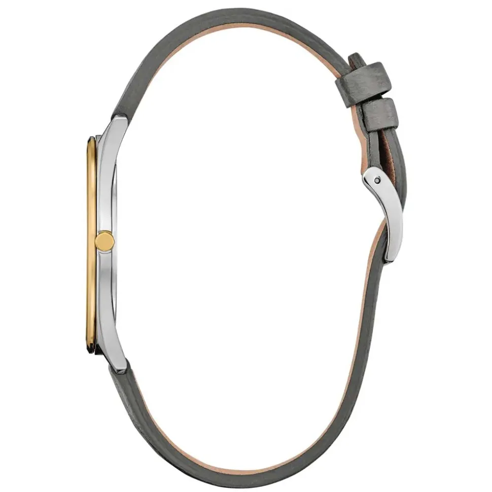 Firstly, the 38mm two-tone stainless steel case strikes a perfect balance between presence and comfort (view silver tone version here). Secondly, the refined grey dial features a luxurious vertical brushed finish. Also, gold-tone applied hour markers contrast beautifully against the dial, ensuring exceptional legibility. Additionally, the slim hour and minute hands enhance the watch’s classic aesthetic, embodying Citizen’s commitment to clean and modern design.