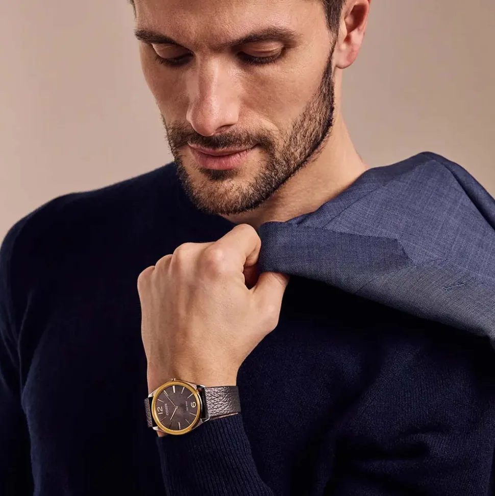 Finally, a grey leather strap completes the watch with its grained texture and natural lining, offering both style and comfort. The stainless steel pin buckle ensures a secure fit, making it a pleasure to wear throughout the day.