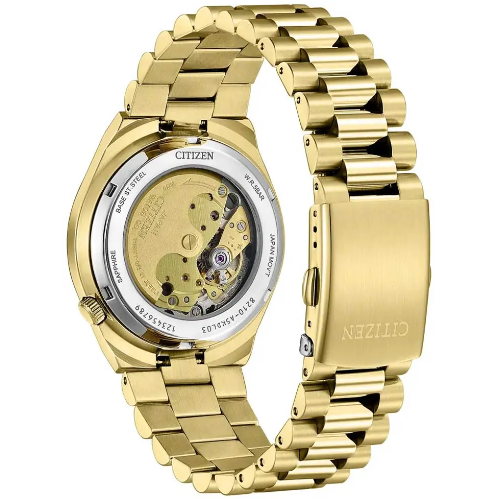 An automatic movement equips the Tsuyosa and you can view it in action via the glass caseback. Also, the watch is water resistant to 5 bars (50m). Finally, an integrated gold tone stainless steel bracelet secures the Citizen Tsuyosa Automatic to the wrist.
