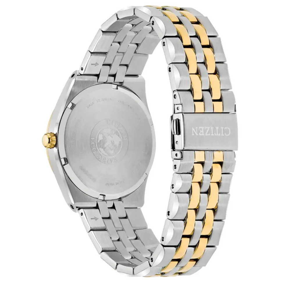 First, the 40mm case of the Citizen Two Tone Bracelet Watch boasts clean lines that seamlessly merge with the bracelet, creating a refined look with alternating brushed steel and polished gold tone links. Second, the watch features a folding clasp with a push-button release for added security. Moreover, the warm gold bezel beautifully complements the crisp white dial (view blue dial version here). Additionally, simple applied gold indexes and a white minute track ensure the watch’s legibility, allowing you to read the time at a glance. Similarly, the hour and minute hands are equipped with a luminous coating, making them visible even in low-light conditions. Also, the pointed tips on the hands enhance accuracy. Finally, the watch is water resistant to 10 bar (100m).
