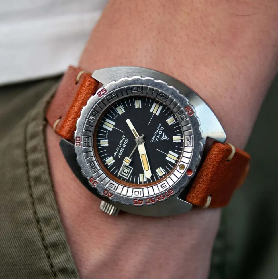 The hide used for this strap has an amazing texture and with its burnt orange shade, it’s the perfect choice for adding a bright touch of colour to your timepiece. Also, the leather will develop a beautiful patina over time, and only get better with age. This strap has a more pronounced tapering, which gives it a nice vintage look. Moreover, two stitches at the ends and by the buckle add a further vintage detail to this strap.