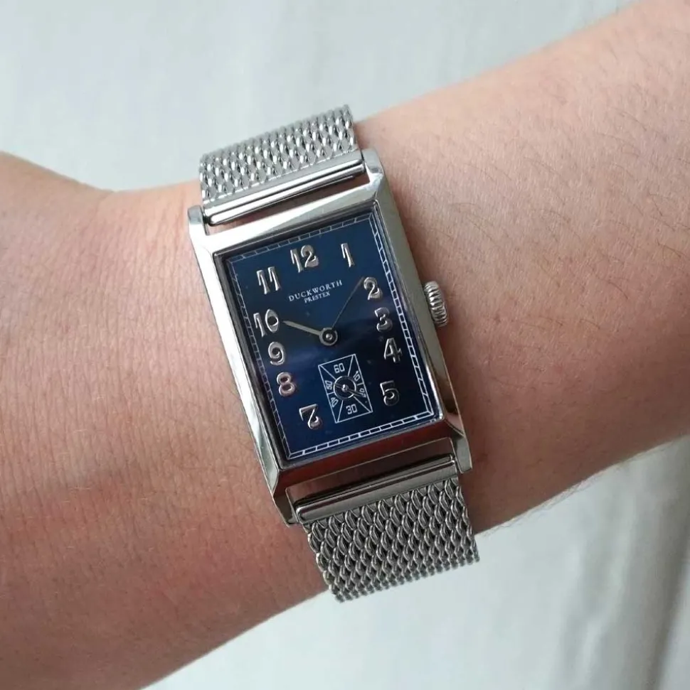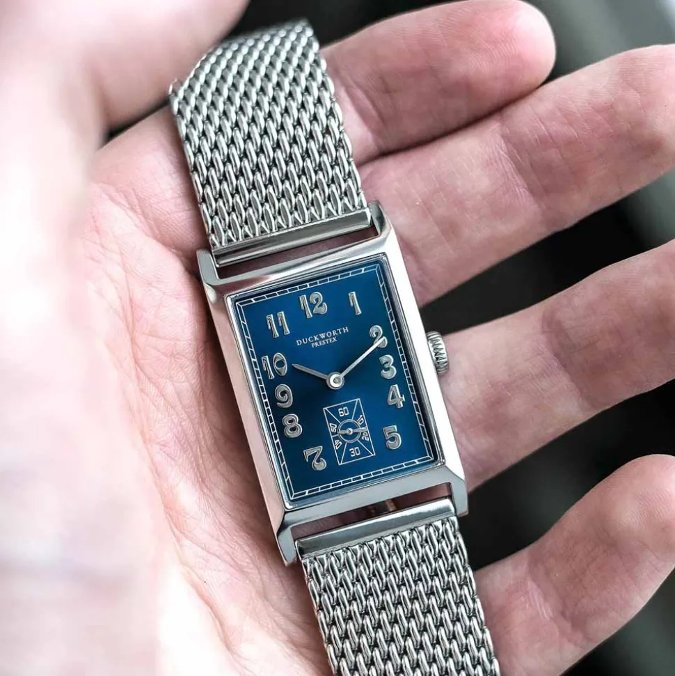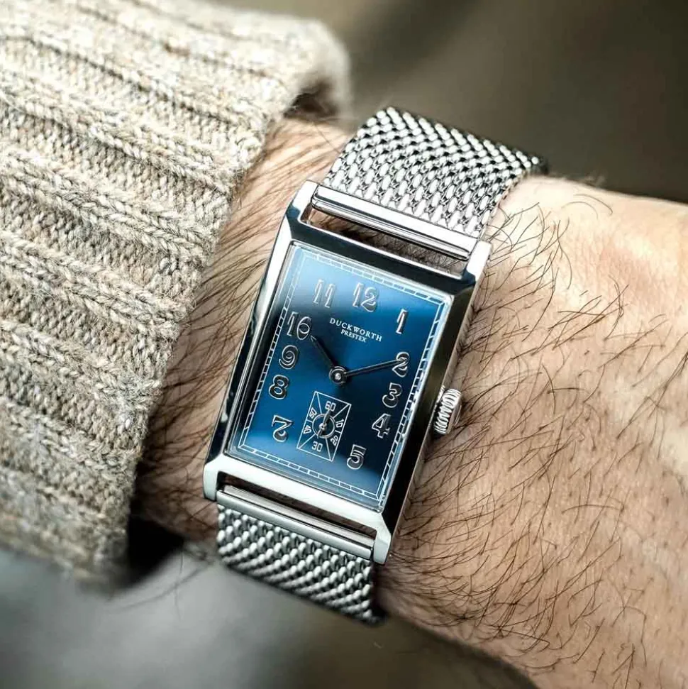 The Duckworth Prestex Centenary Watch with Midnight Blue Dial marks the 100th anniversary of the first Prestex pocket watch in 2024. A modern recreation of a 1935 Art Deco Prestex dress watch, the new watch is a true heritage piece.