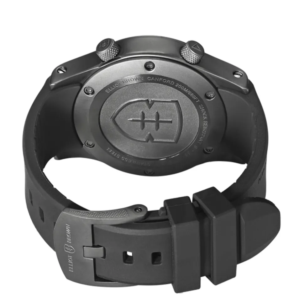 The Elliot Brown Canford Black Rubber Strap Watch has a Swiss-made quartz movement with an End Of Life indicator to tell you when its time to change the battery. Also, the movement sits inside a unique shock-absorbing steel movement housing.
