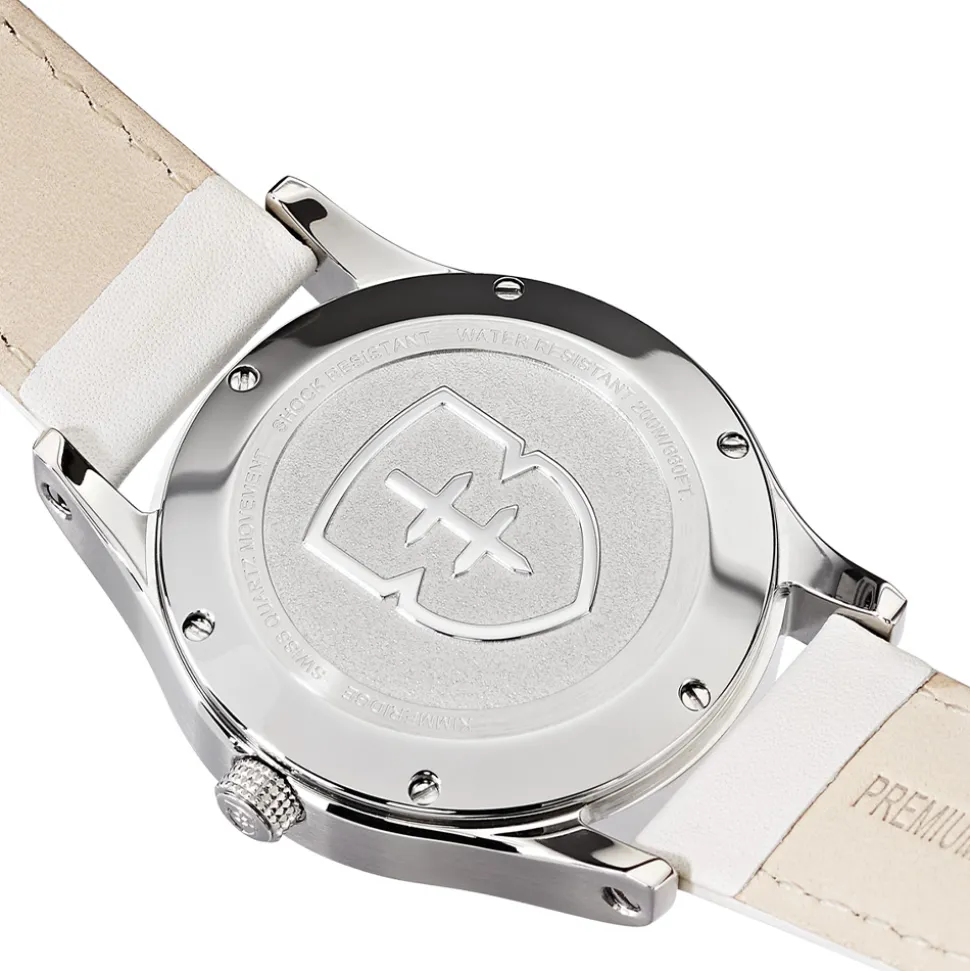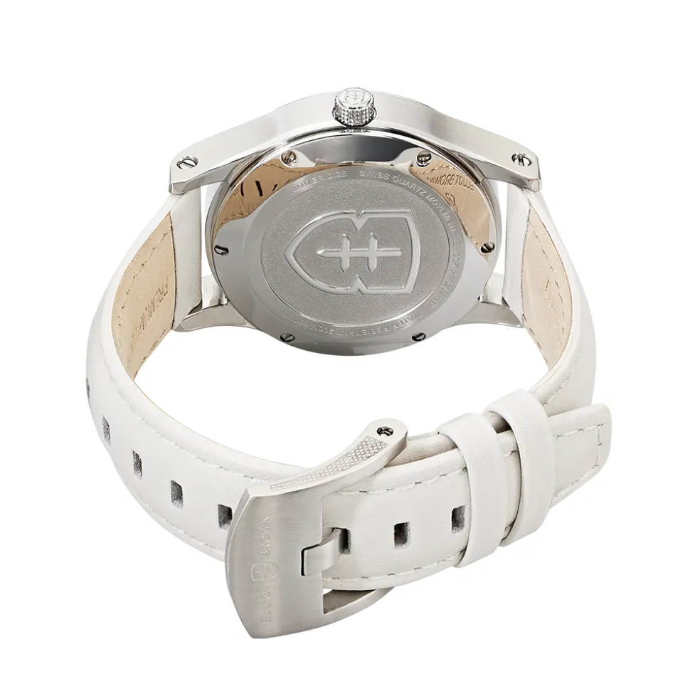 Firstly, the 38mm stainless steel case is in a finely brushed and polished finish. Secondly, the contemporary champagne dial is clear and easy to read with elegant slender graphics. Additionally, there is a custom date window at 4 o’clock. Furthermore, bright luminous ink floods the hands that glow cool blue at night for maximum legibility.