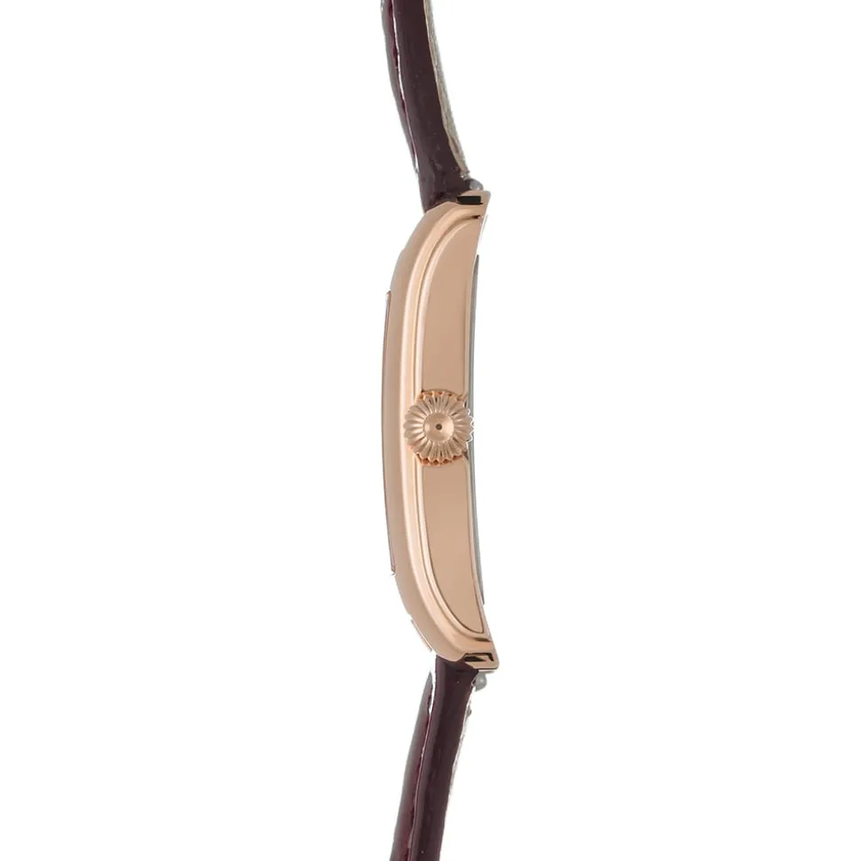 - Burgundy leather strap, rose gold tone stainless steel pin buckle