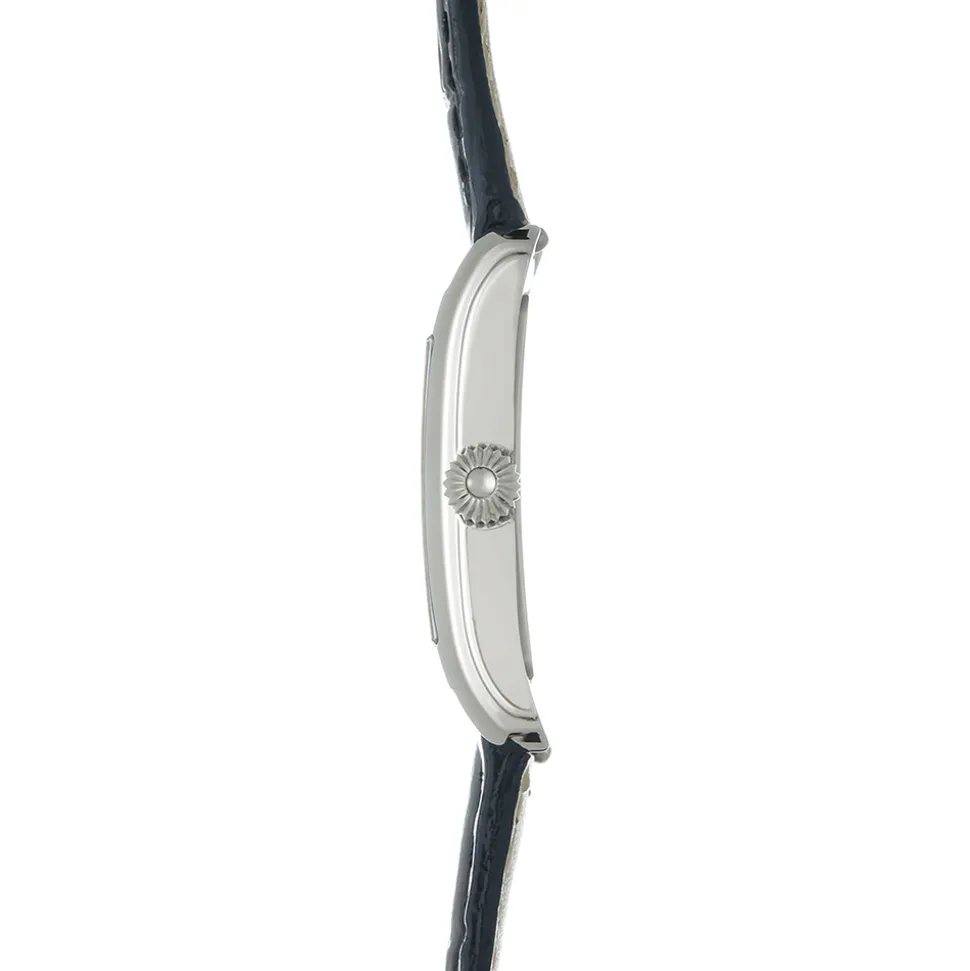 With it’s fluid, clean lines, the look is chic and avant-garde. In polished stainless steel, the case is complemented by a fluted crown. This gives the watch a vintage feel. The silver dial has intricate “clous de Paris” decoration in a central chapter ring. A black minute track surrounds the chapter ring and and printed roman numerals are at the edge. Finally, hand polished black hands and a convex sapphire crystal add the finishing touches.