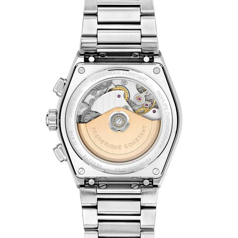 The Frederique Constant Highlife Chronograph combines craftsmanship, quality and design. First launched by Frederique Constant over 20 years ago, the Highlife collection is characterised by the special bracelet built into the case. Consequently, the brand has updated this ingenious concept so it is possible to switch between a steel bracelet, a leather or rubber strap. Therefore, enabling you to change your look on a whim! Discover more about the Highlife collection here.
