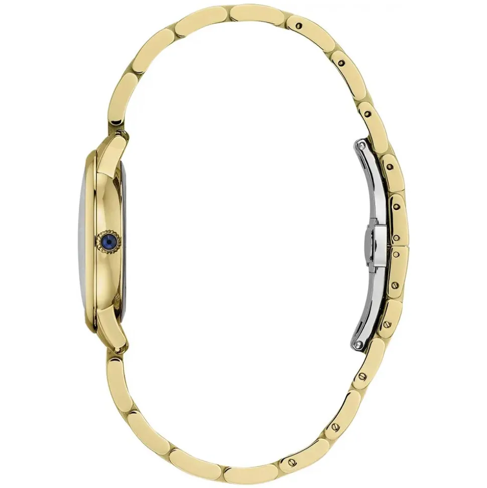 Firstly, its 30mm case is ultra-feminine. In slimline gold tone stainless steel, it suits even the most slender of wrists with its minimal profile (view two tone version here). Also, the sleek polished bezel provides a nice contrast to the more traditional, fluted crown. Furthermore, the crown features a blue cabochon to add a touch of class.