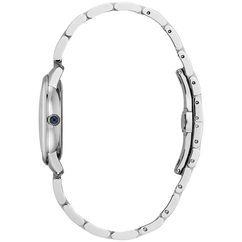 Firstly, its 30mm case is ultra-feminine. In slimline stainless steel, it suits even the most slender of wrists with its minimal profile (view two tone version here). Also, the sleek polished bezel provides a nice contrast to the more traditional, fluted crown. Furthermore, the crown features a blue cabochon to add a touch of class.