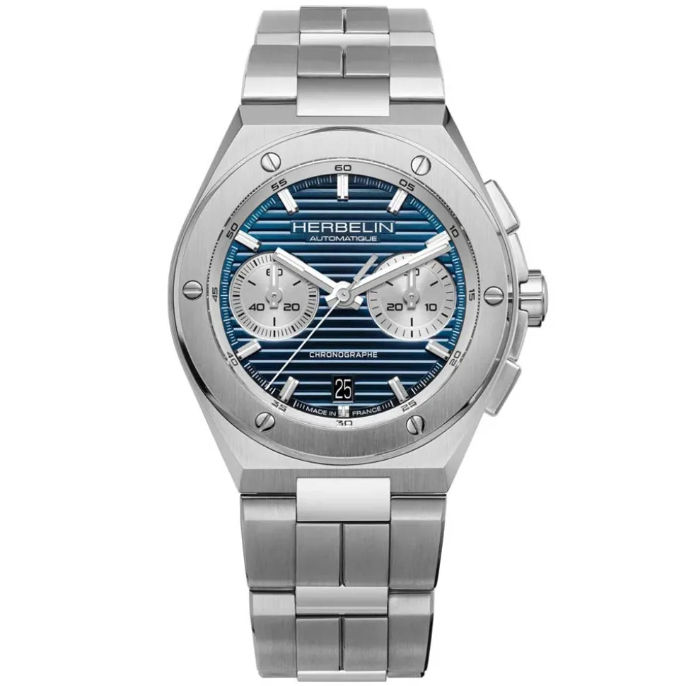 Firstly, with a sculpted 42mm stainless steel case, the Herbelin Cap Camarat Automatic Chronograph has brushed bezel set with 6 decorative screws. Secondly, the blue dial features the bold horizontal pattern that is synonymous with the collection. Also, luminous indexes and hands ensure legibility even in poor light conditions. Additionally, the two silver chrono dials contrast well against the blue dial. Furthermore, a scratch-resistant sapphire crystal protects the dial.