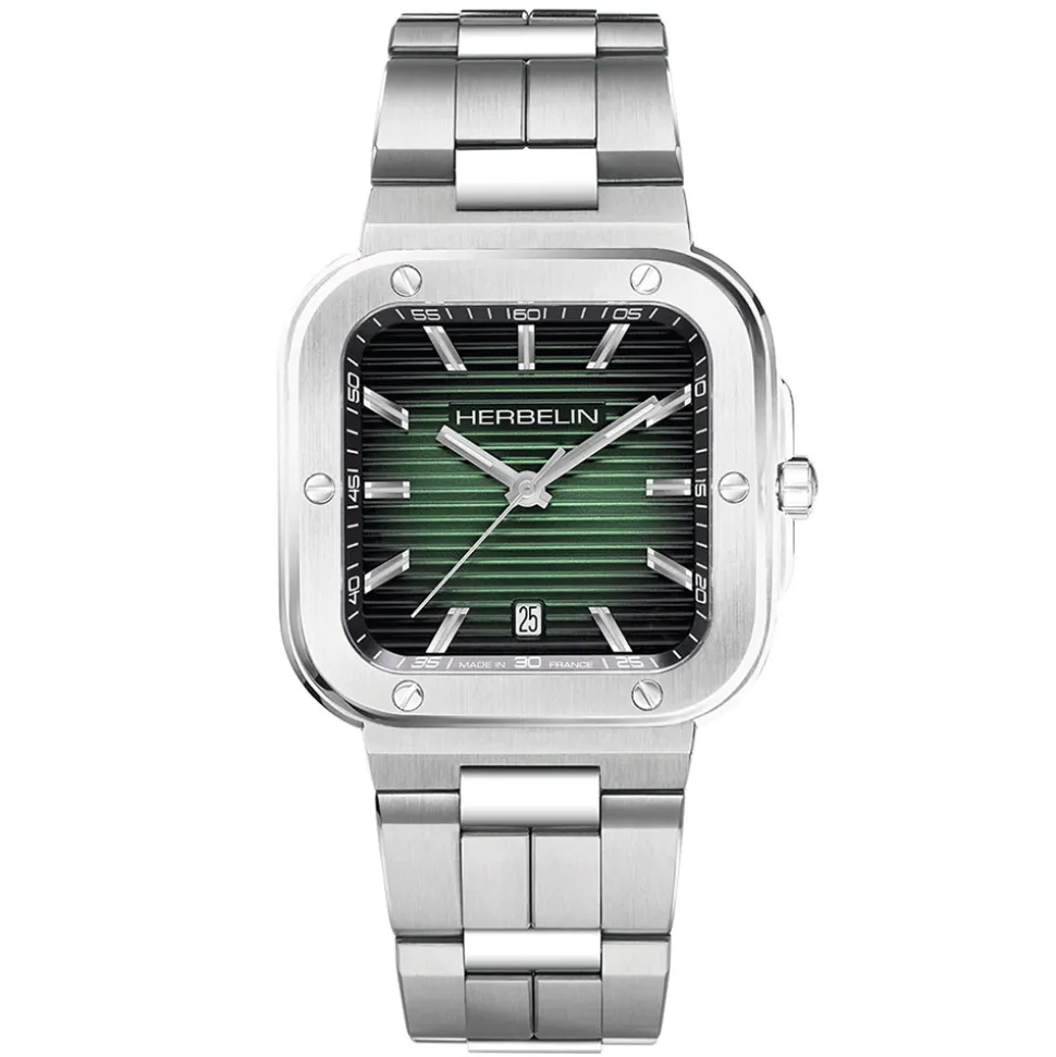 Firstly, the square 39mm stainless steel case has a brushed bezel set with 6 decorative screws. Secondly, the green dial has a striking horizontal pattern with applied steel indexes and hands (blue and red dial versions are also available). Coated in a luminous material, they ensure legibility in poor light conditions. Additionally, a scratch-resistant sapphire crystal protects the dial. Furthermore, the substantial stainless steel bracelet is in a brushed and polished finish. A folding clasp ensures the security of the watch. Finally, water resistant to 10 bar (100 m) and with a reliable Swiss Ronda quartz movement, the Herbelin Cap Camarat Green Dial Watch is a practical timepiece that guarantees style.