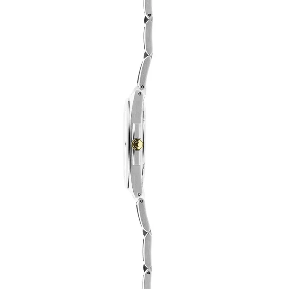 - White Mother of Pearl dial with horizontal lined pattern, applied gold tone indexes