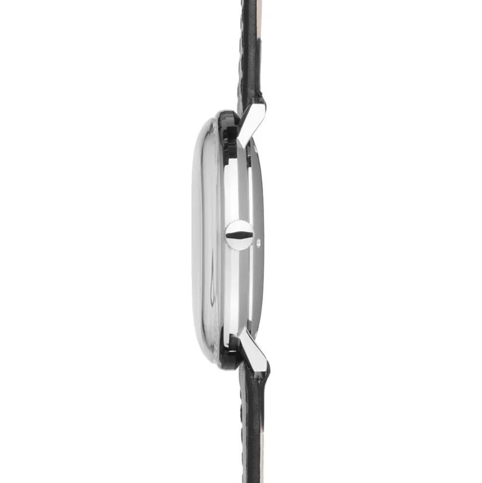 Firstly, with a 38mm stainless steel case, the Junghans Max Bill Automatic watch has a large dial opening. The case is pared-back with minimal bezel. Consequently, the time is the focus of the watch rather than what is surrounding it. Secondly, designed with legibility and accuracy in mind, the dial is black with printed indexes. Additionally, the hour markers are taken to the extreme outer edge of the dial to draw the eye in to the time. Furthermore, the narrow hands and hour markers are shaped for precision. Also, an environmentally friendly luminous substance coats the hands and dots on the dial to ensure legibility in poor light conditions.