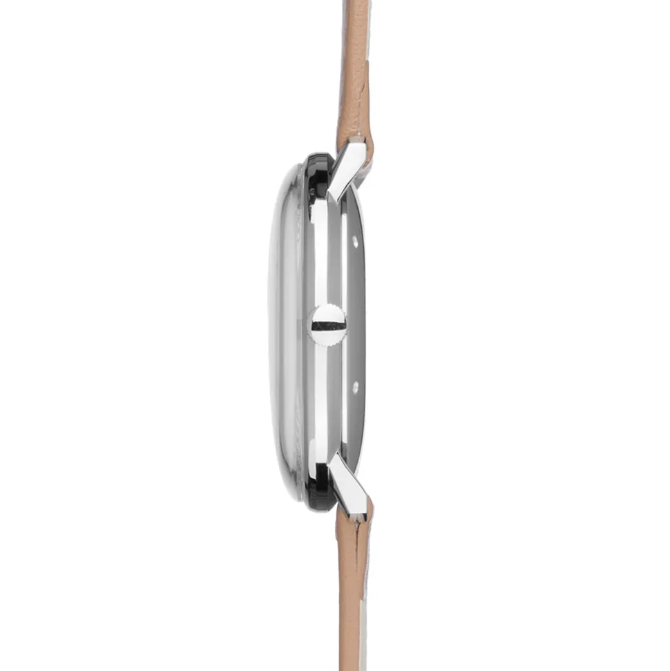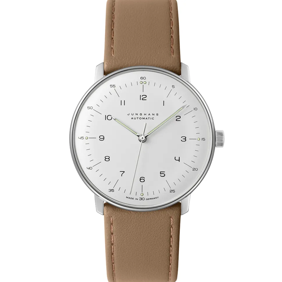 With a 38mm stainless steel case, the Max Bill Automatic has a large dial opening and pared back case with minimal bezel. Consequently, the time is the focus of the watch rather than what is surrounding it. Designed with legibility and accuracy in mind, the dial is in a silver-plated white finish with printed arabic numerals and indexes. The hands are shaped for precision and along with the minute track are coated with a luminous substance to ensure legibility in poor light conditions. Fitted with a reliable J800.1 automatic movement, the watch has a power reserve of up to 38 hours. The supple strap is in light tan leather with a stainless steel pin buckle.