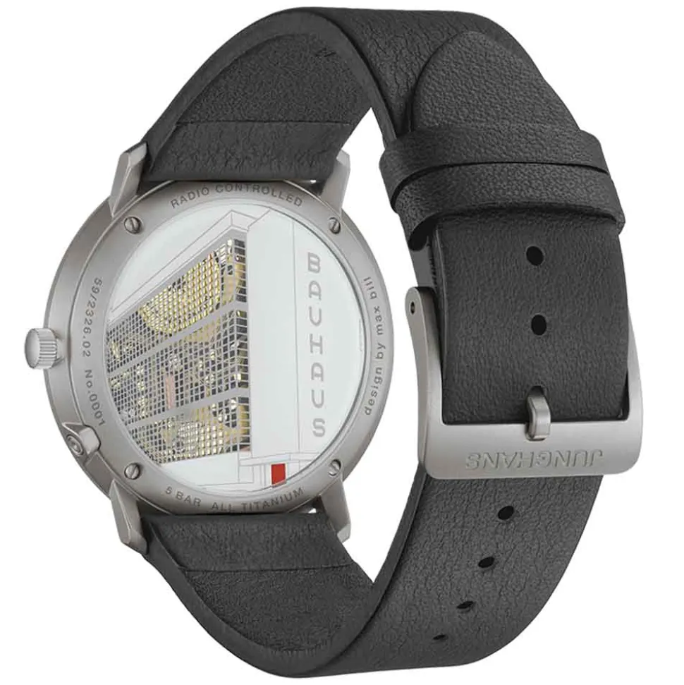 Junghans have gone to great lengths to ensure that this watch “bears the fundamental ideas ingrained in the very fabric of the Bauhaus”. Firstly, the white dial commemorates the white walls of the Bauhaus building in Dessau and the grey dial printing represents the striking concrete facade. Also, red accents on the hands and date wheel mirror the colour of the prominent entrance door of the famous design school. Furthermore, the caseback allows the wearer to view the workings of the solar movement within through a printed motif of the windows of the Bauhaus. Just the famous front door is picked out in red. Moreover, a plain calf leather strap completes the minimalist look and a titanium pin buckle secures it to the wrist.