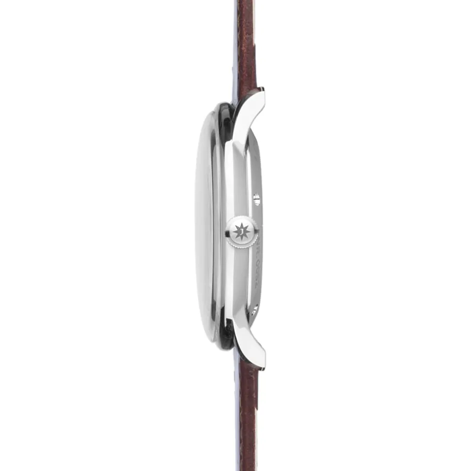 The glass is a convex, hard plexiglass coated with Sicralan to enhance scratch resistance. Moreover, the dial is in a silver-plated white finish with applied indexes and printed hour markers. Additionally, the stainless steel hour and minute hands are coated with an environmentally friendly luminous substance. This ensures maximum legibility in poor light conditions. Finally, the Meister Classic is completed with a brown horse leather strap with stainless steel pin buckle.