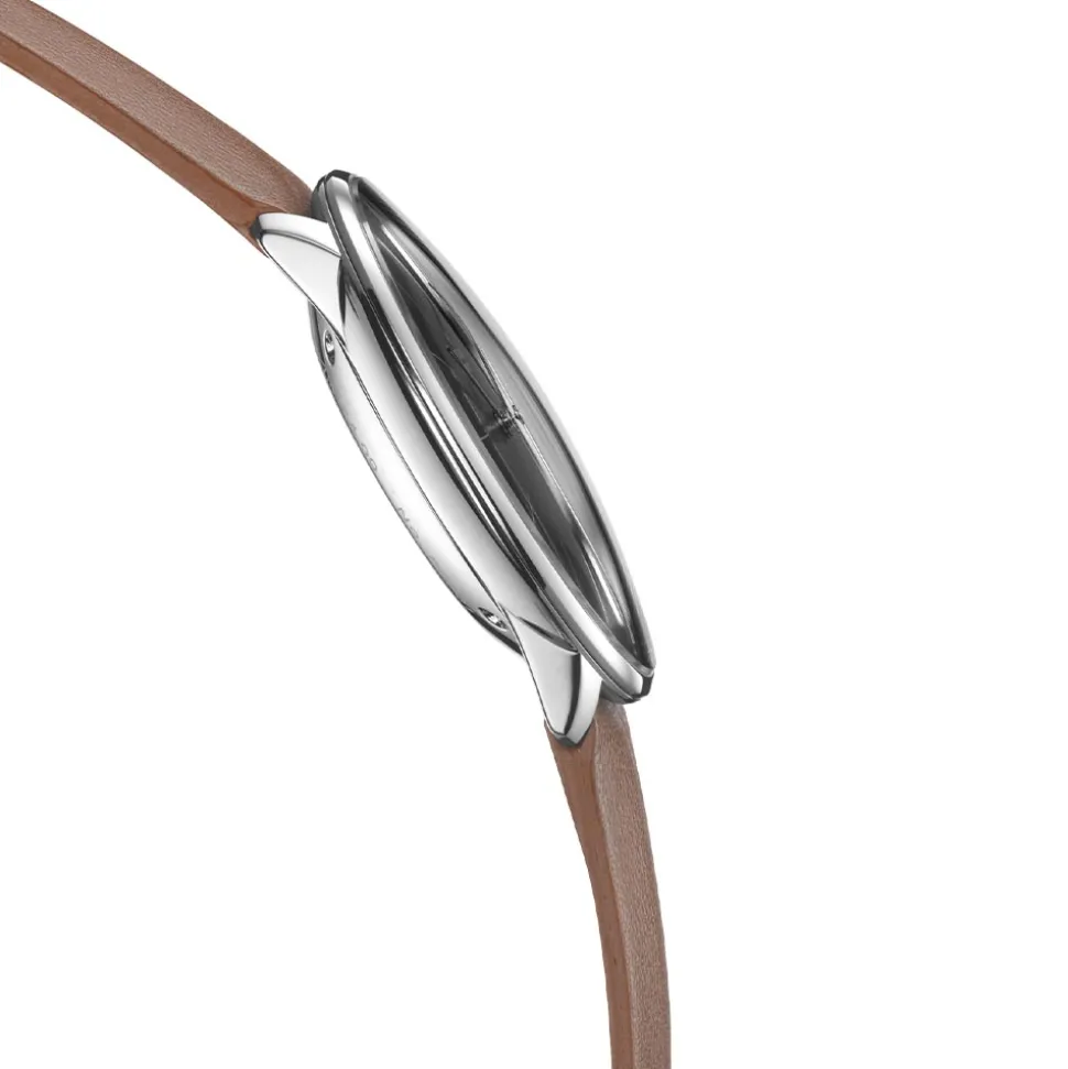 Firstly, the reliable J800.1 automatic movement is housed within a 39.5mm diameter stainless steel case. Also, with a 38 hour power reserve, the workings can be viewed through the see-through caseback. Secondly, the black dial of the Junghans Meister Fein Automatic features long, slender hour markers. Similarly, the hour and minute hands are also in a slim baton shape to complement the dial markers. Furthermore, a date indicator at 3 o’clock is a useful feature. Moreover, a domed sapphire crystal protects the dial and an anti-reflective coating reduces glare and improves legibility. Also, the watch is water resistant to 50m. Finally, a soft brown leather strap provides the finishing touch and a stainless steel pin buckle secures it to the wrist.