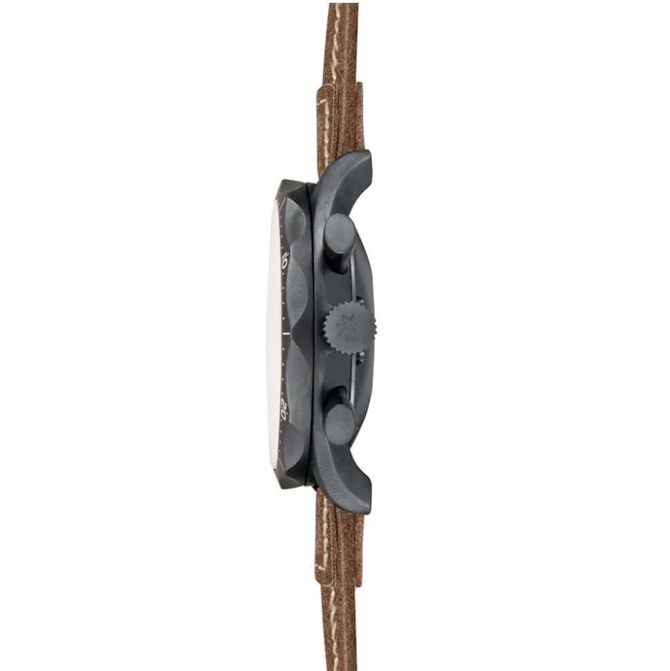- Riveted Brown leather strap with white contrast stitching and black PVD stainless steel buckle
